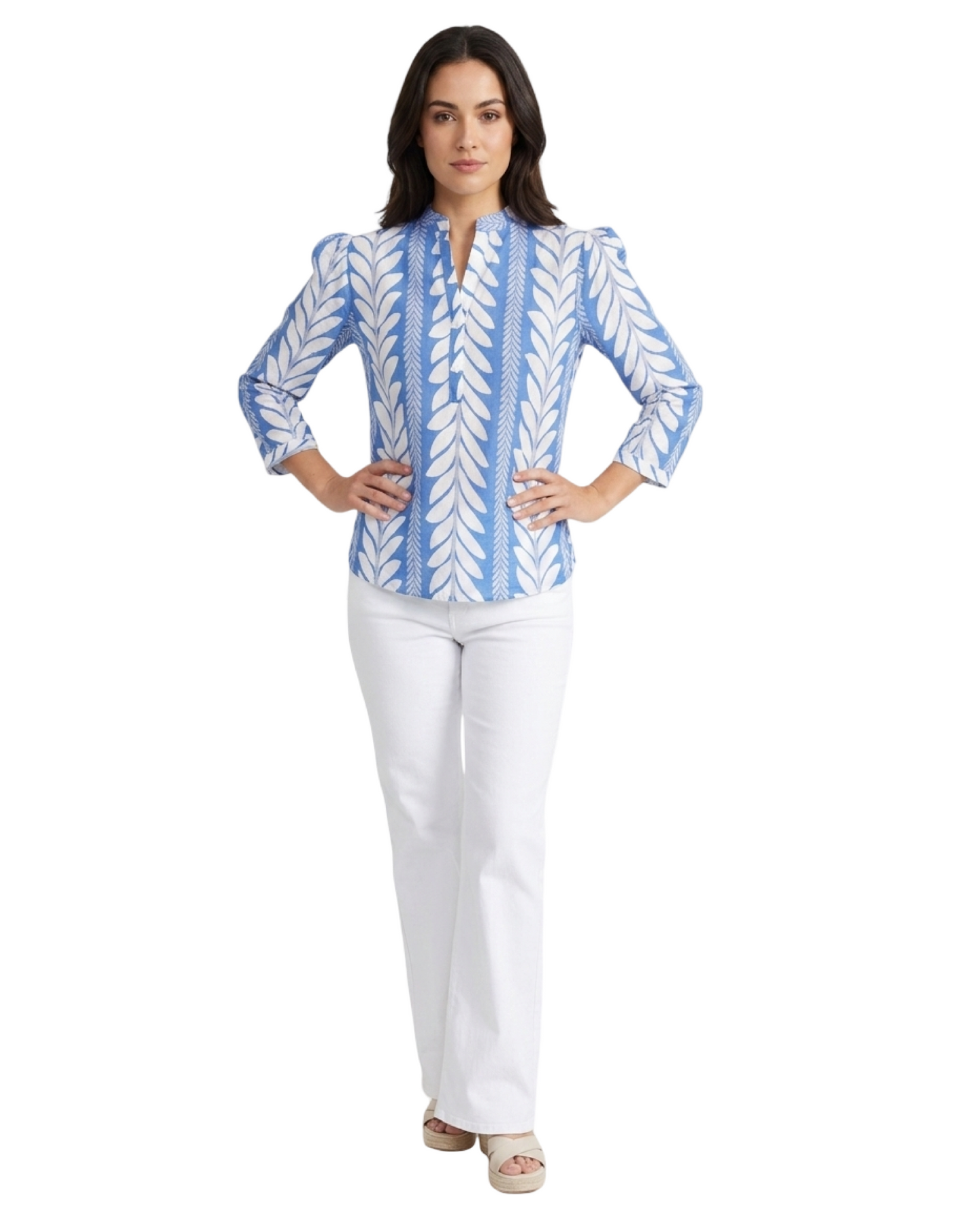 A beautiful cotton tunic in a flattering combination of blues. A party ready style with notch neck detailing and figure flattering cut. The Addison top is an easy fit and endless possibilities. Cold gentle wash line dry. Model is 5'8" wearing a size small.