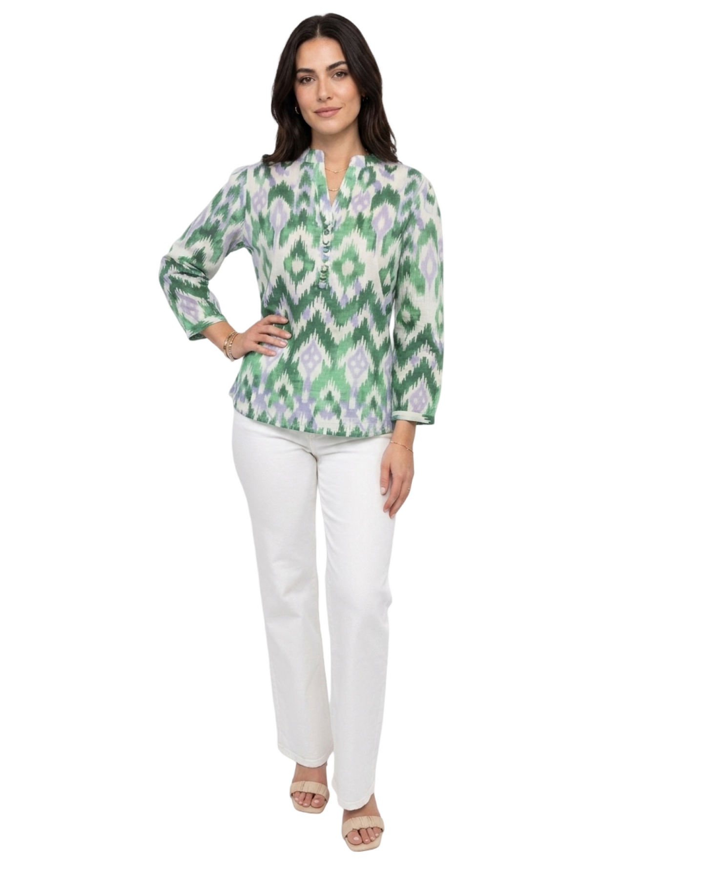A beautiful cotton tunic in a flattering combination of green and purple. A party ready style with self-covered button detailing and figure flattering cut. The Addison top is an easy fit and endless possibilities. Cold gentle wash line dry. Model is 5'8" wearing a size small.