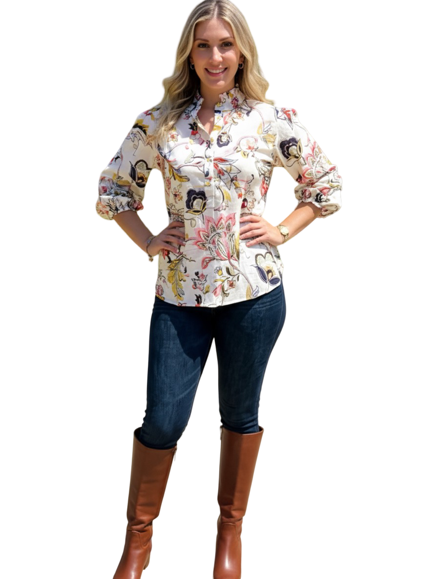 An easy and fun ruffle collar blouse in soft cotton. A beautiful top with gold button front placket and 3/4 length sleeves finished with elastic ruffle trim cuff. Hand wash line dry. Model is 5'9" wearing a size small.