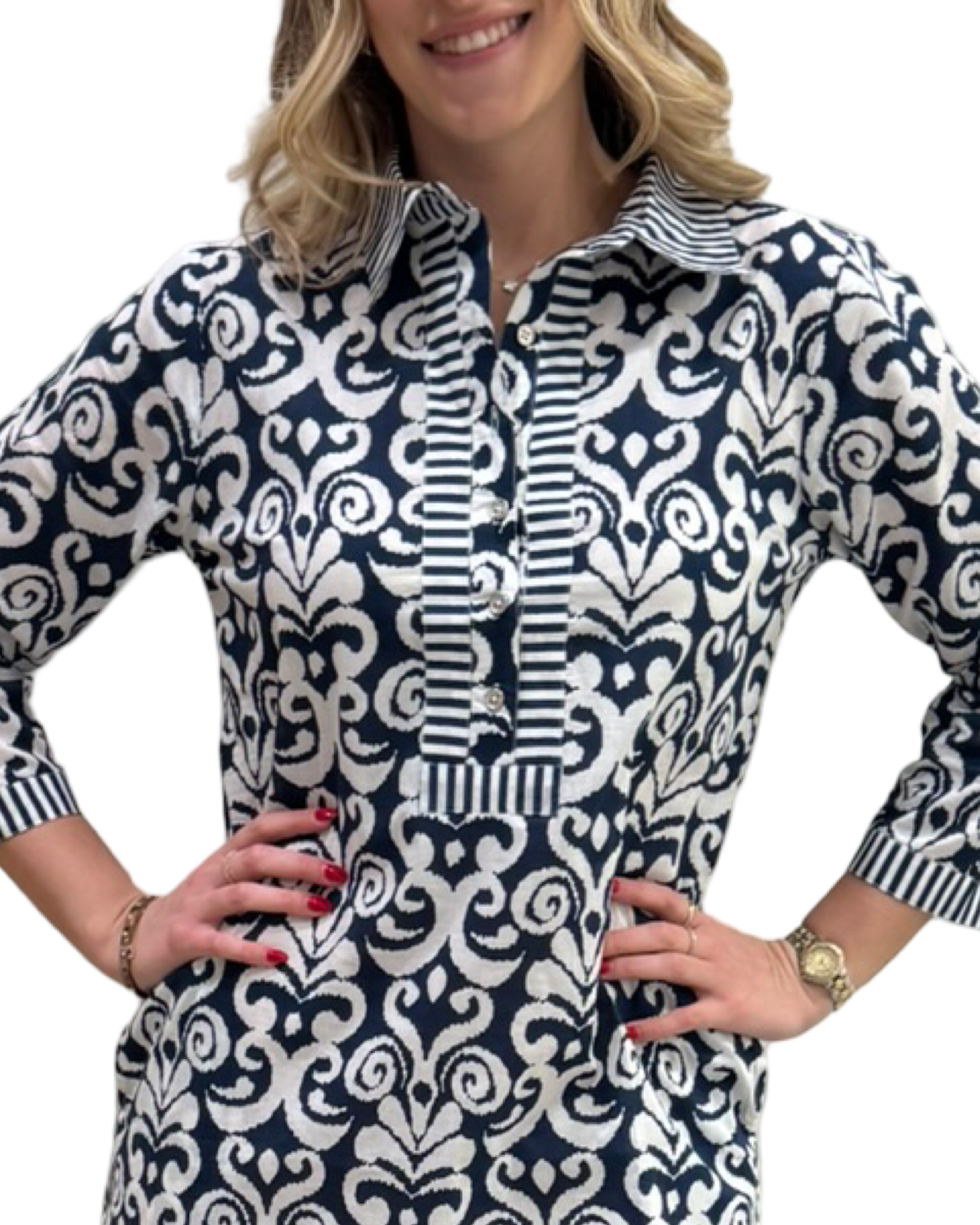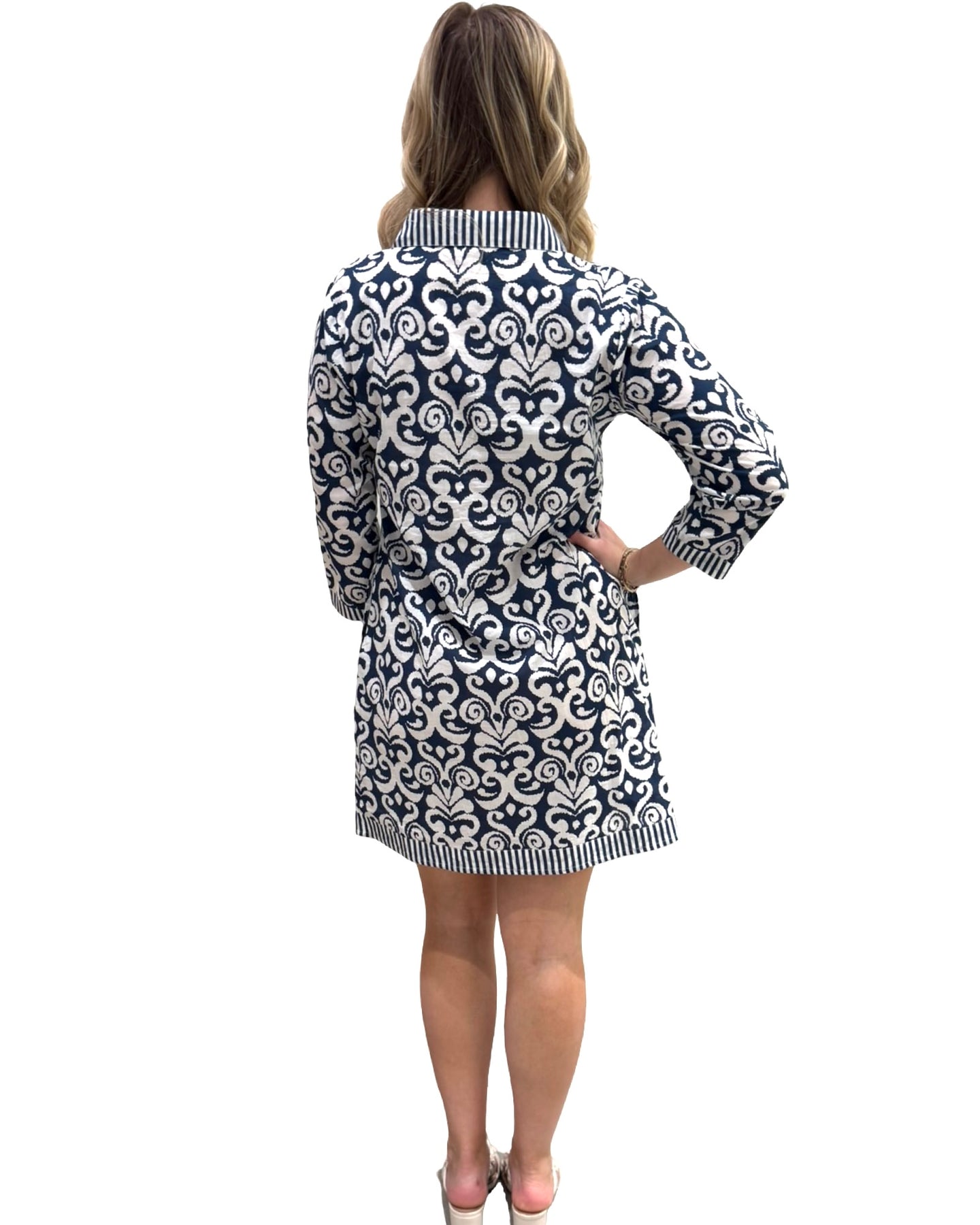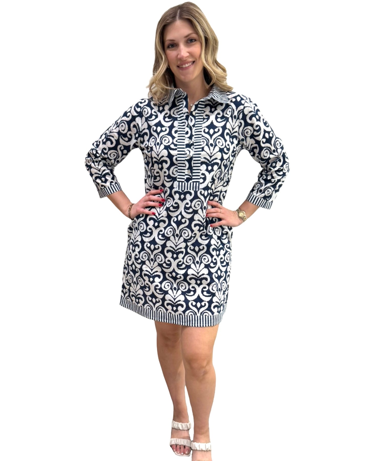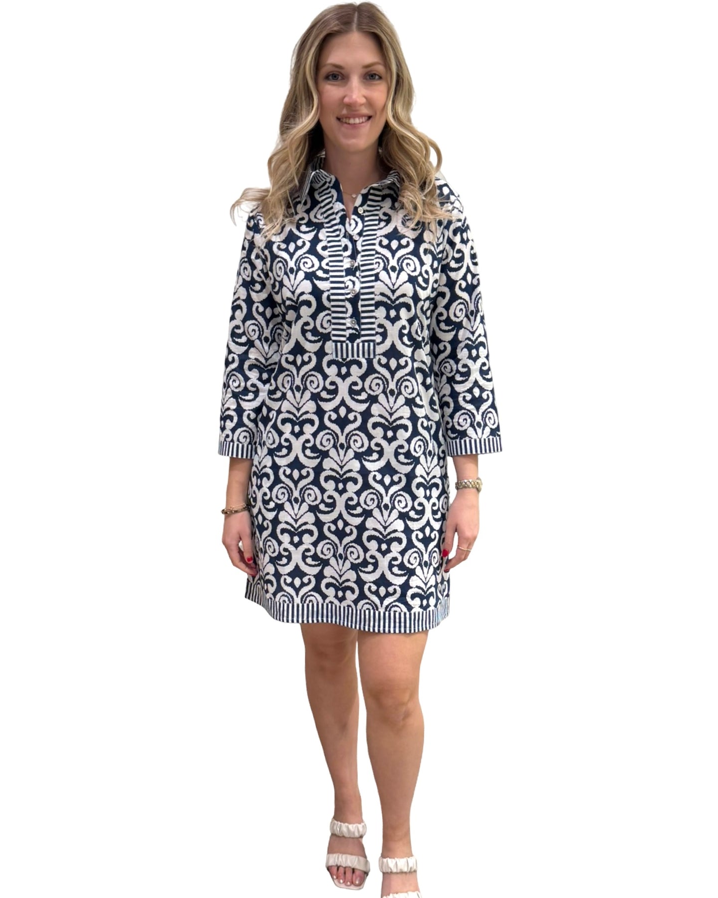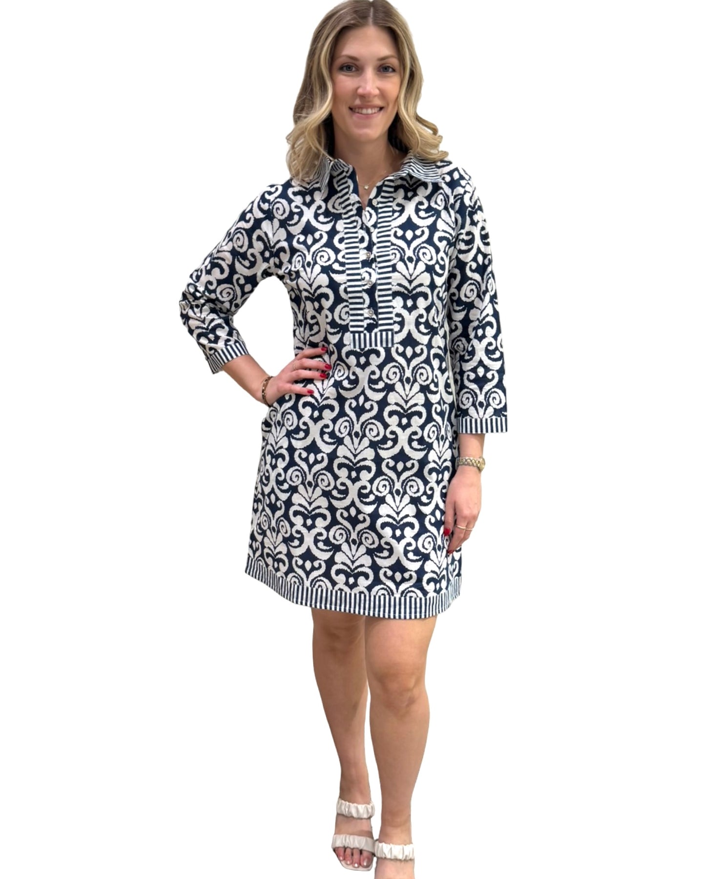 A versatile over-the-head shirt dress with side pockets. A beautiful streamlined classic silhouette in cotton with collar detail, self covered buttons and unlimited possibilities. Cold gentle wash line dry. Model in 5'9" wearing a size small.