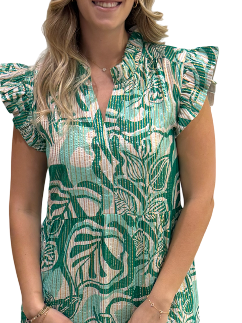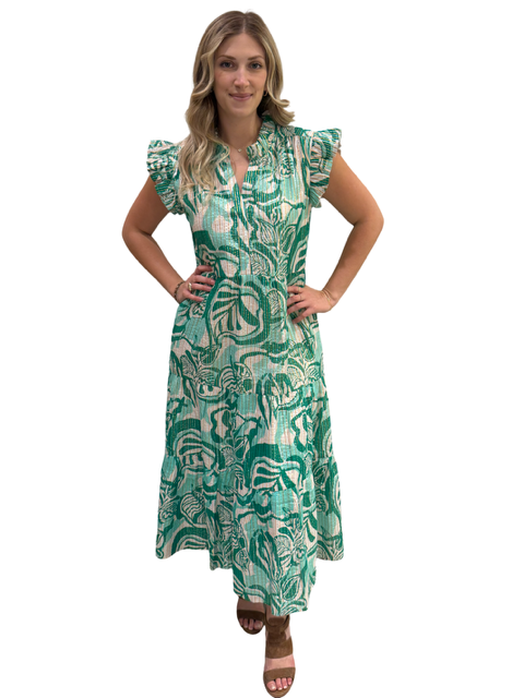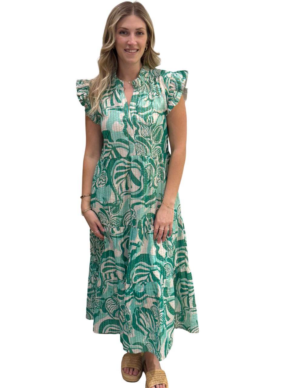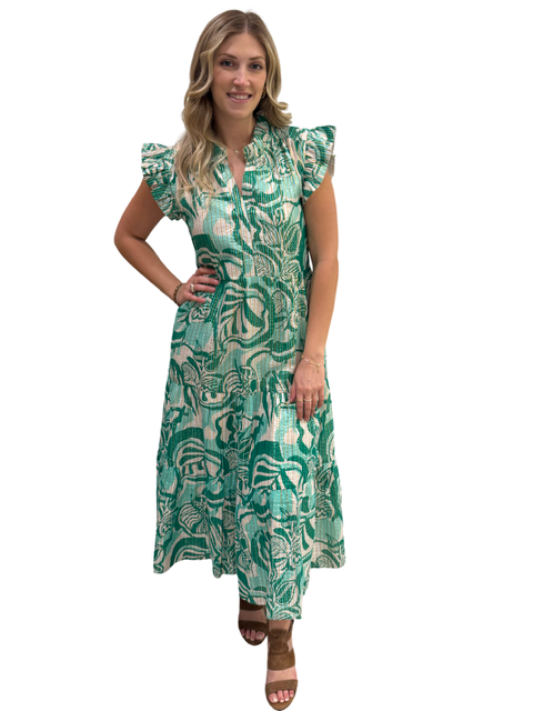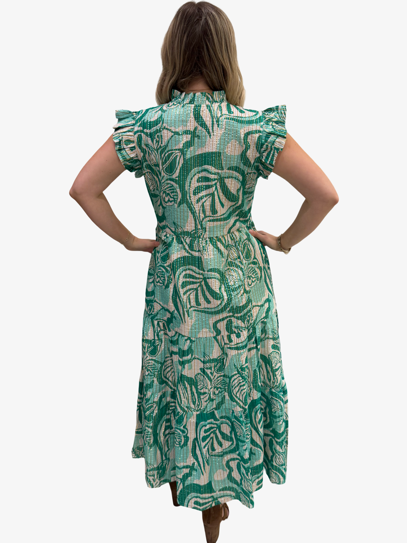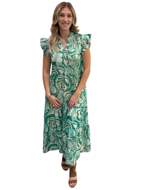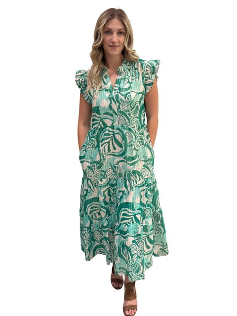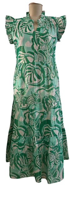 An easy to wear soft cotton print lined dress with ruffle detailing. A perfect side pocket dress for a bridal luncheon or evening soiree. Long length with a flattering cut.