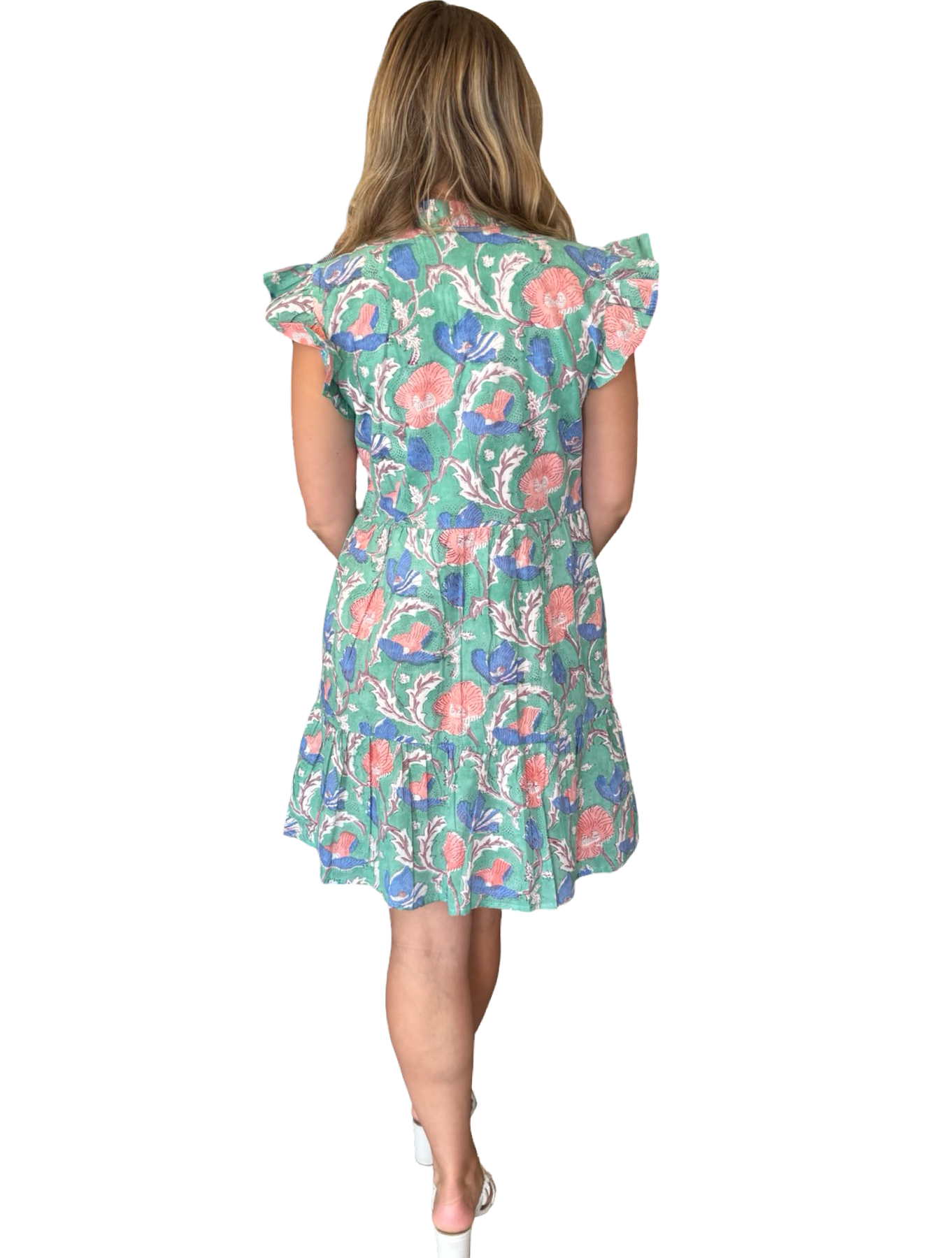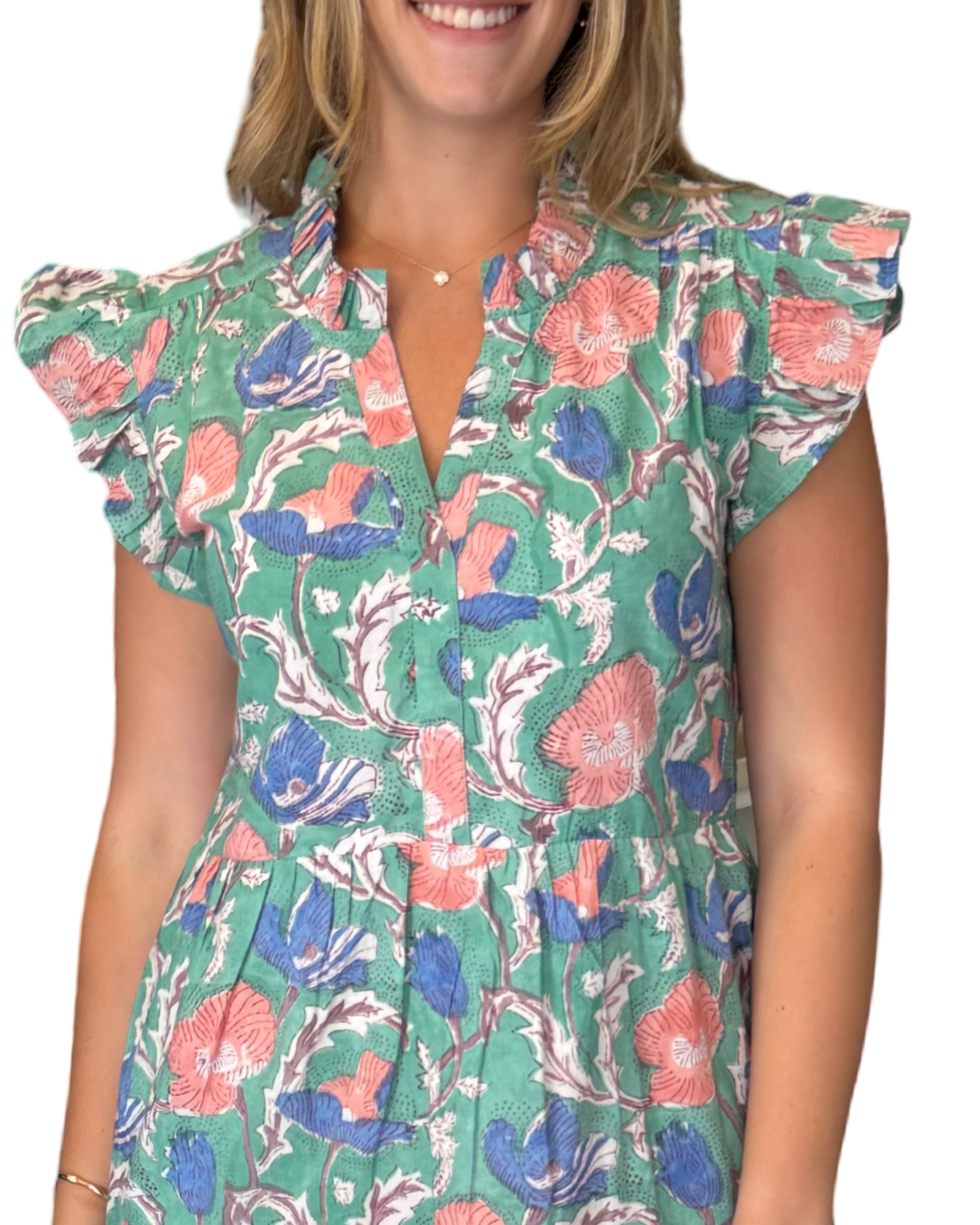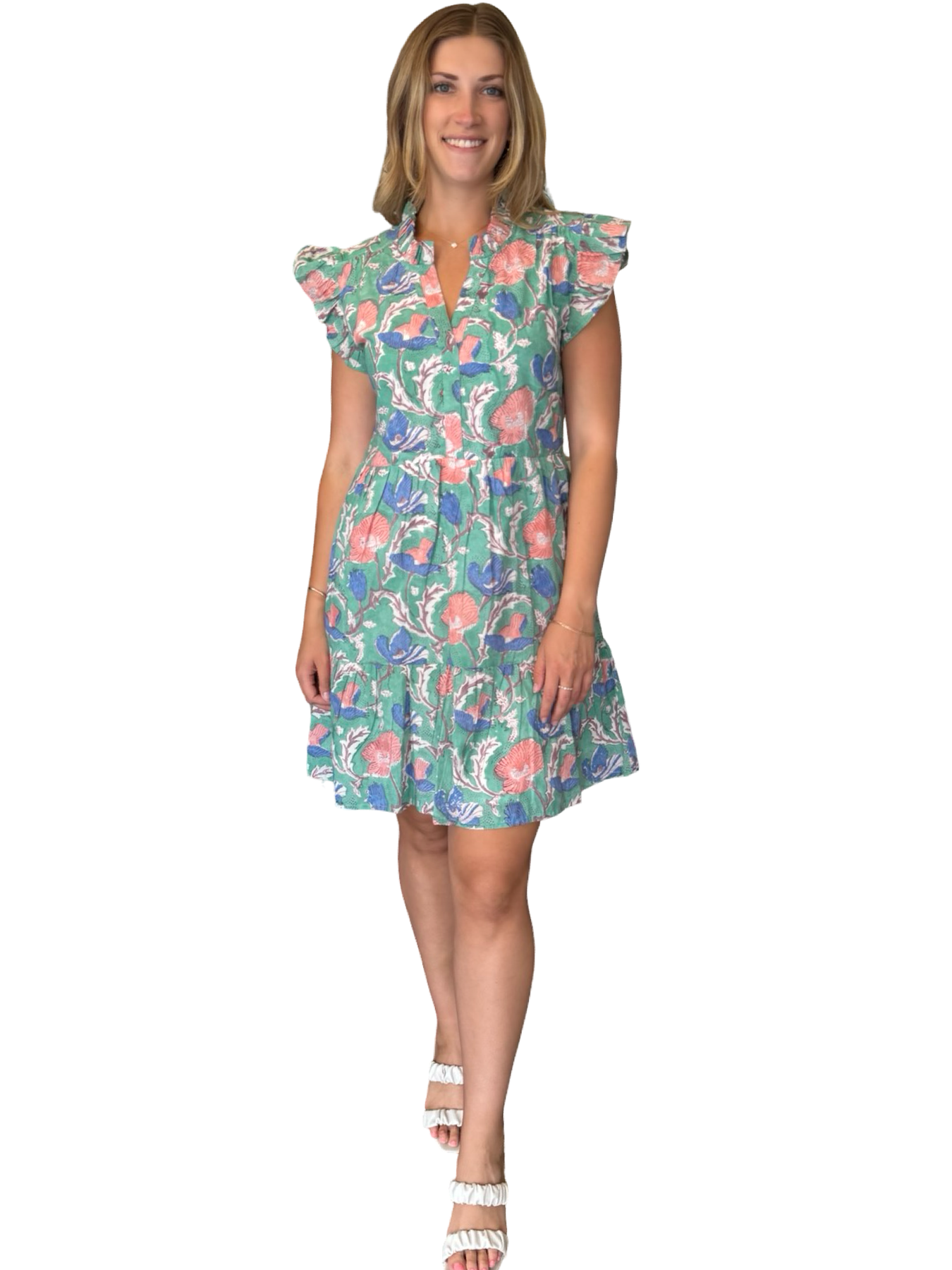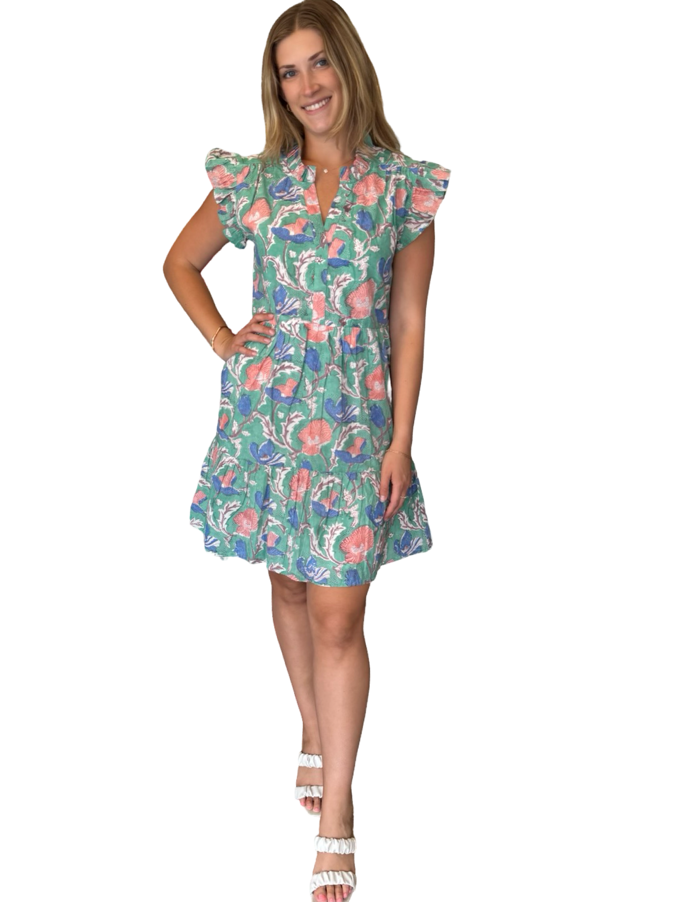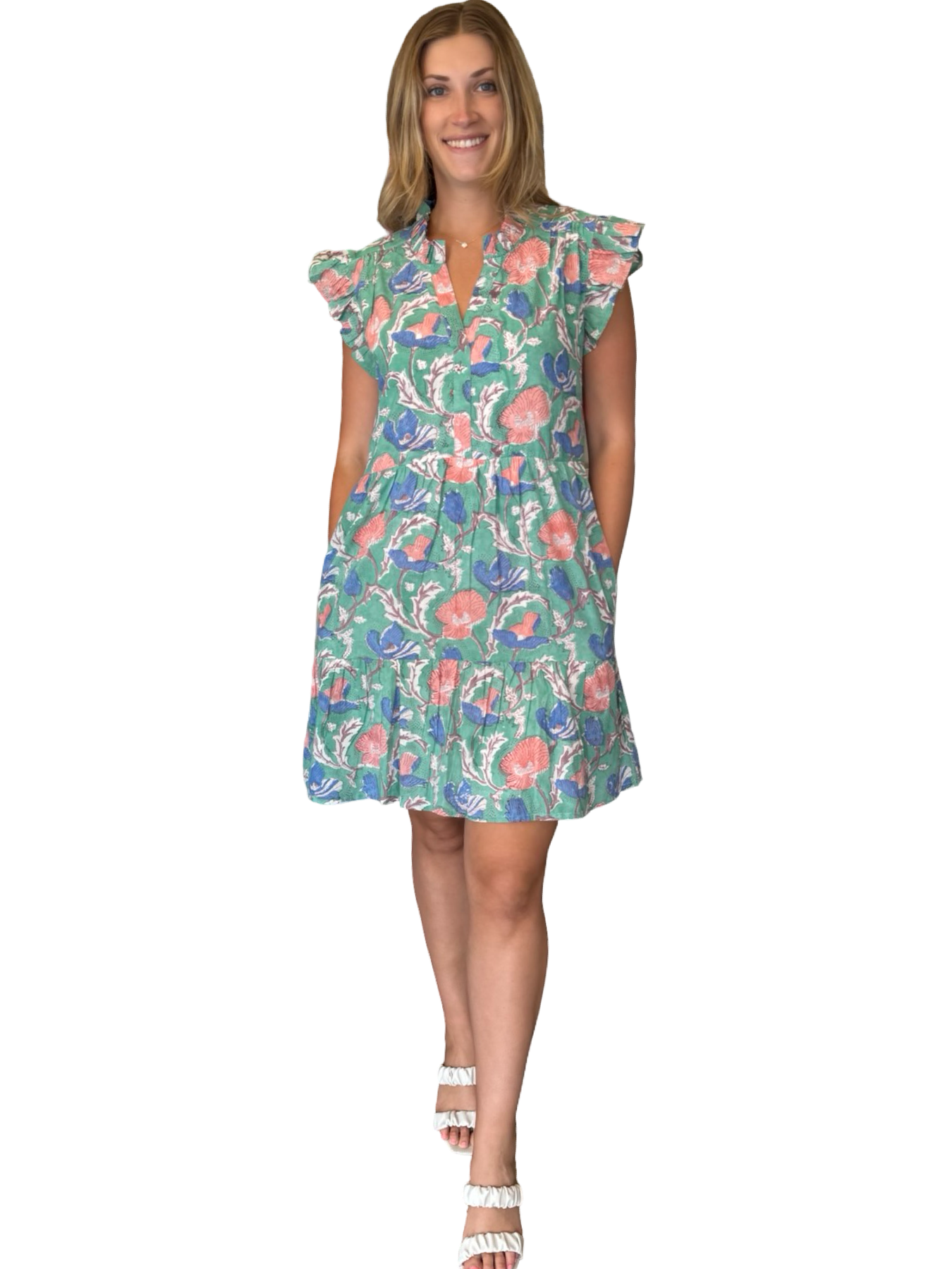 An easy to wear soft cotton print dress with ruffle detailing. A perfect side pocket dress for a bridal luncheon or evening soiree that hits just above the knee. This dress is lined and has a flattering cut.