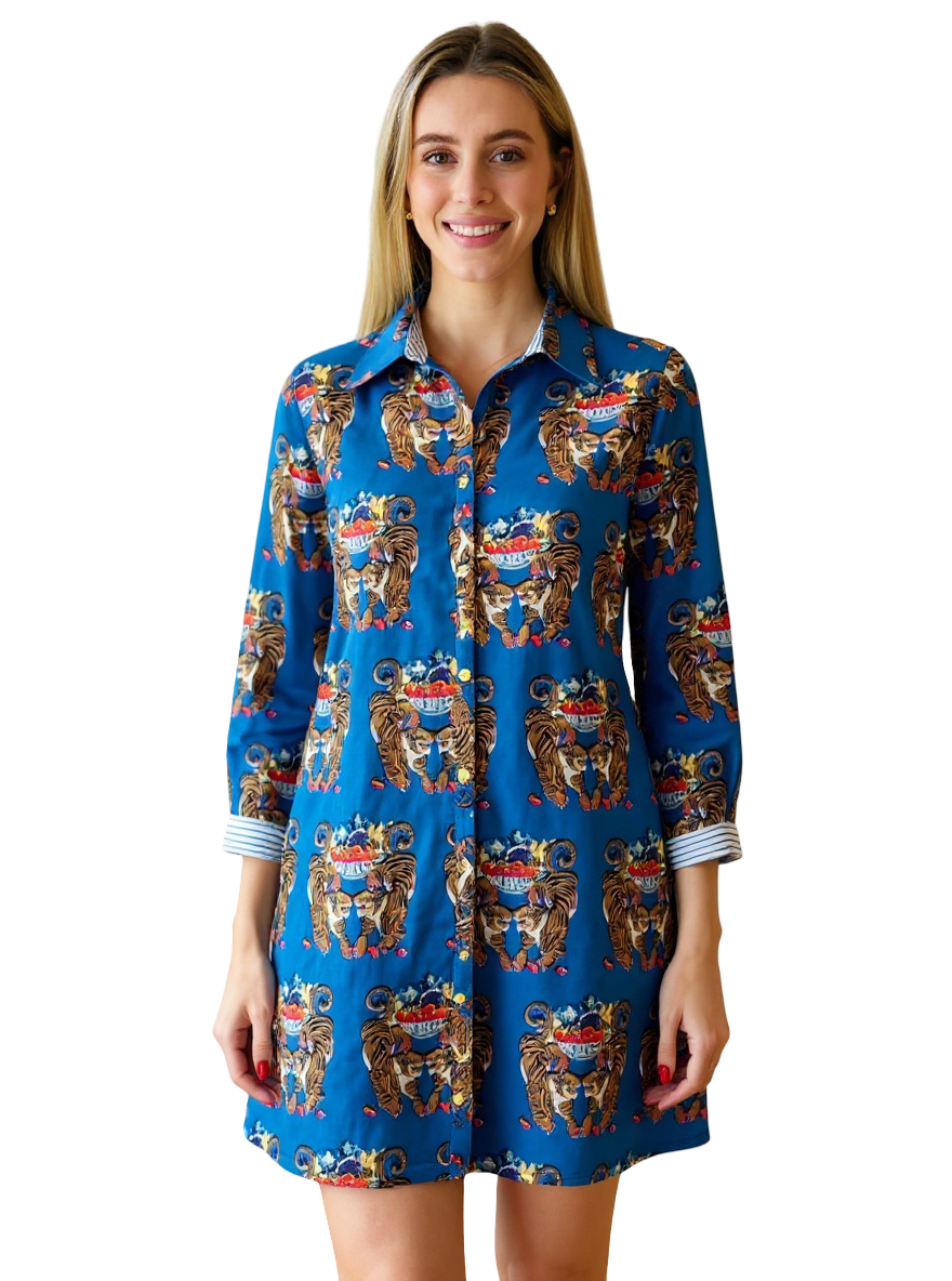 A cotton button front wear-anywhere style shirt dress with striped trim detailing and gold buttons. This is a tailored side pocket dress perfect to pair with boots and leggings or your everyday flats. Model is 5’9”wearing a size X-Small.