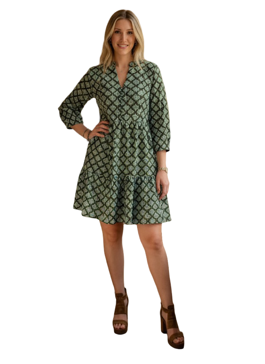 The Preston 3/4 Sleeve Dress in Green Grey Silver Lurex