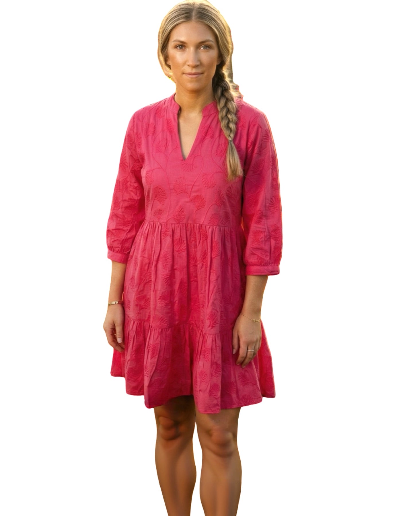 An easy over-the-head 3/4 sleeve side pocket dress. A unique cotton embroidered fabric design on cotton, this lined dress is a perfect style to wear year-round for day to night activities. Model is 5'9” wearing a size small. Cold hand wash line dry.