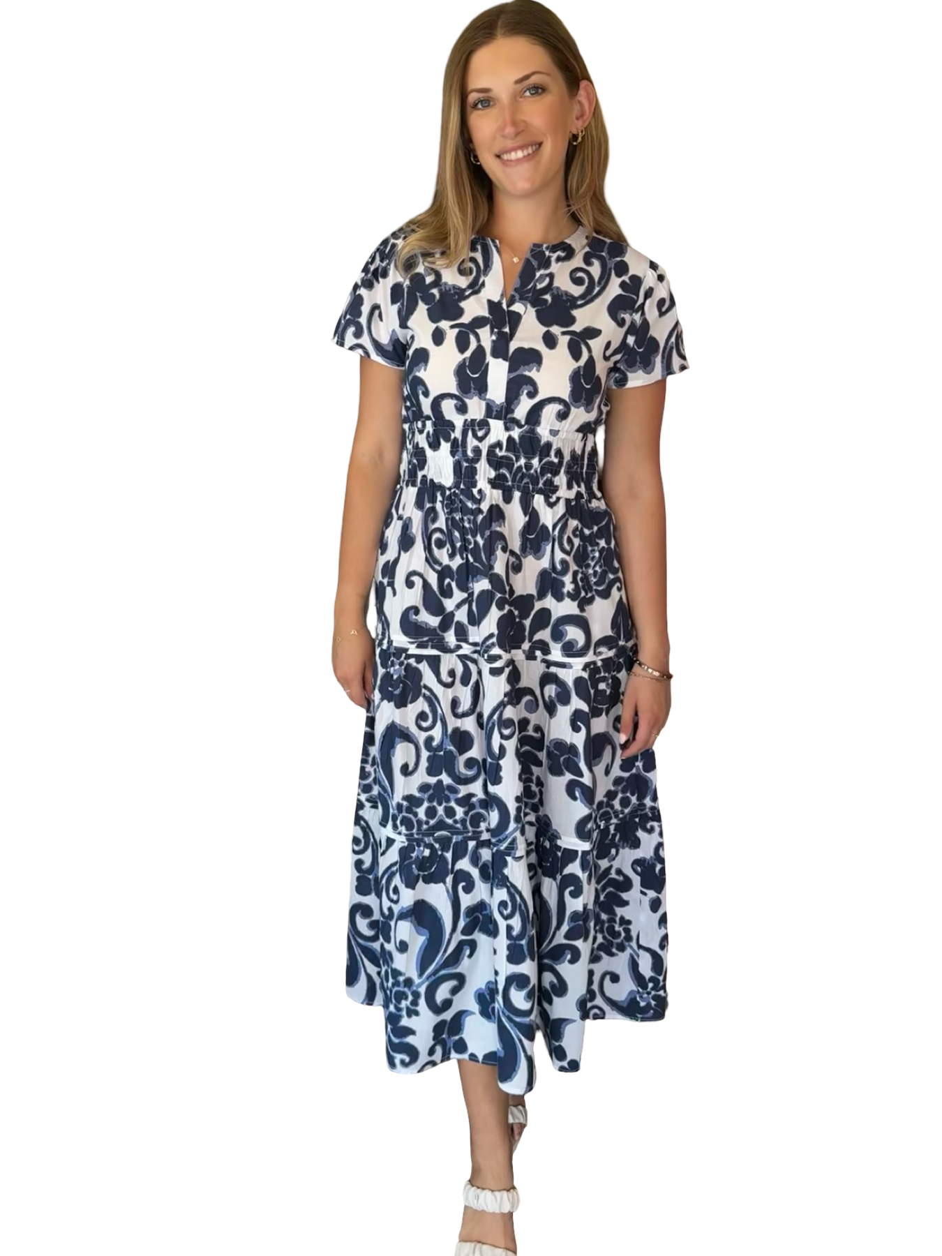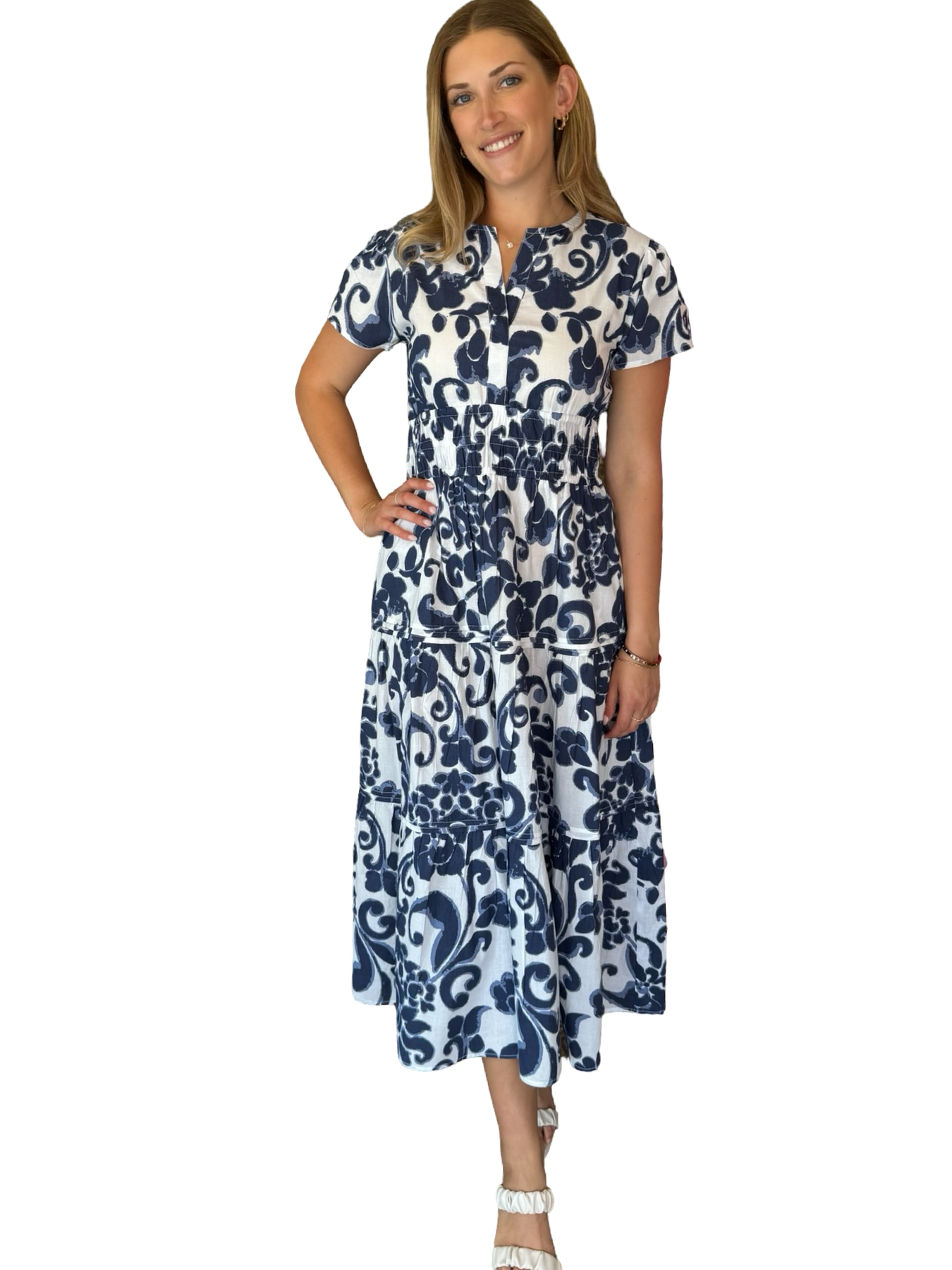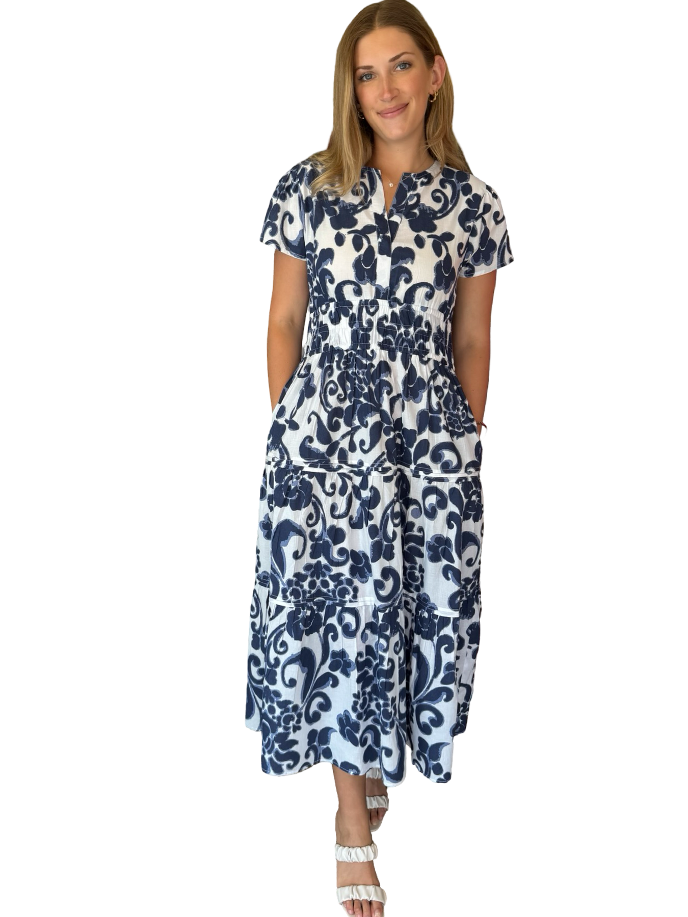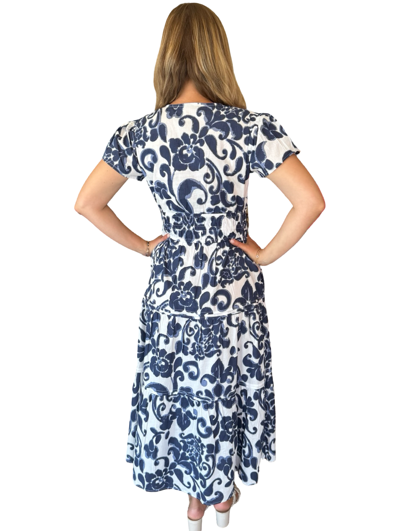 A beautiful longer length flattering dress, with a smocked waistline this style is very flattering on everyone. Extremely versatile, this lined side pocket dress makes the perfect outfit, for wherever your day takes you. Model is 5'9" wearing a size small.