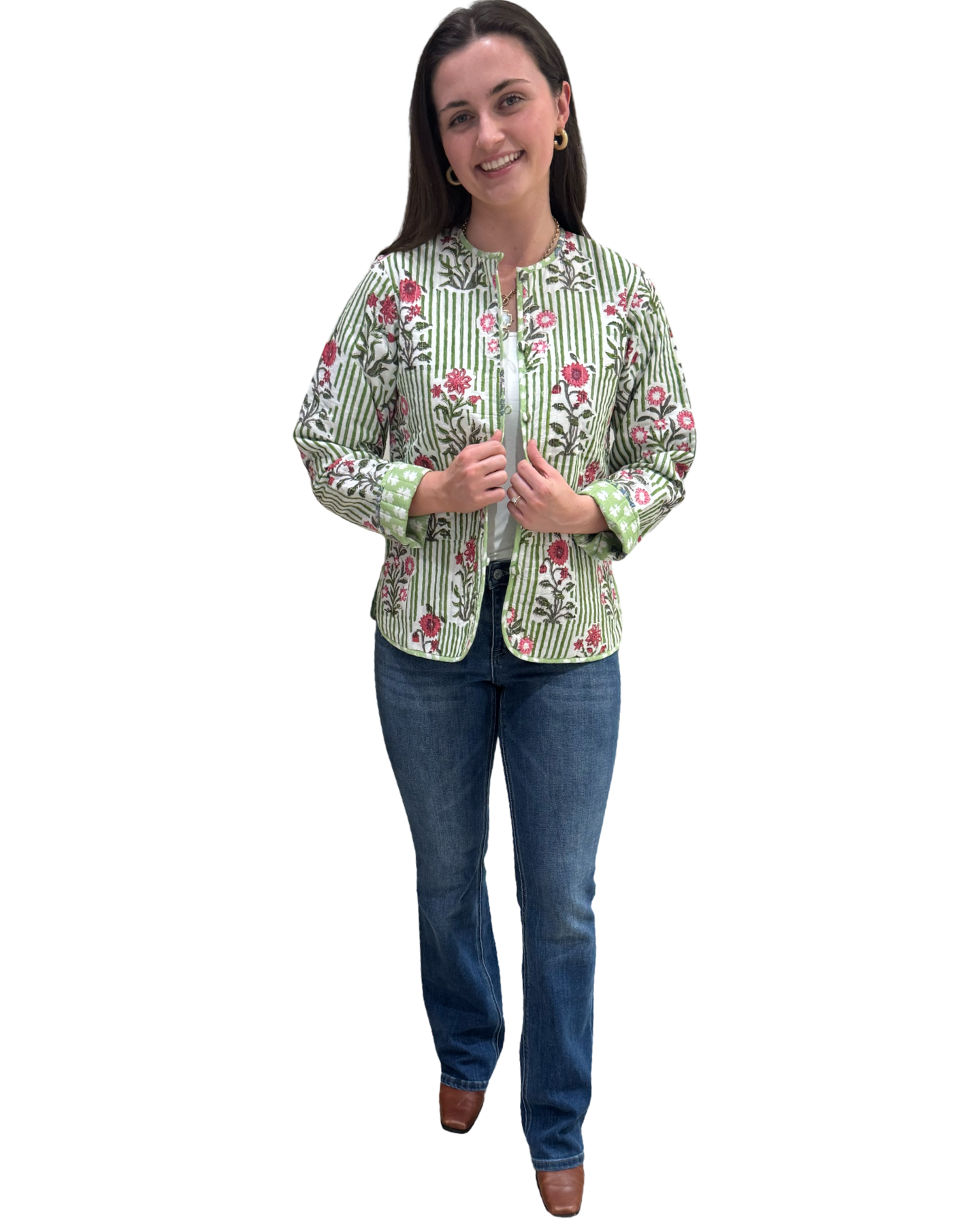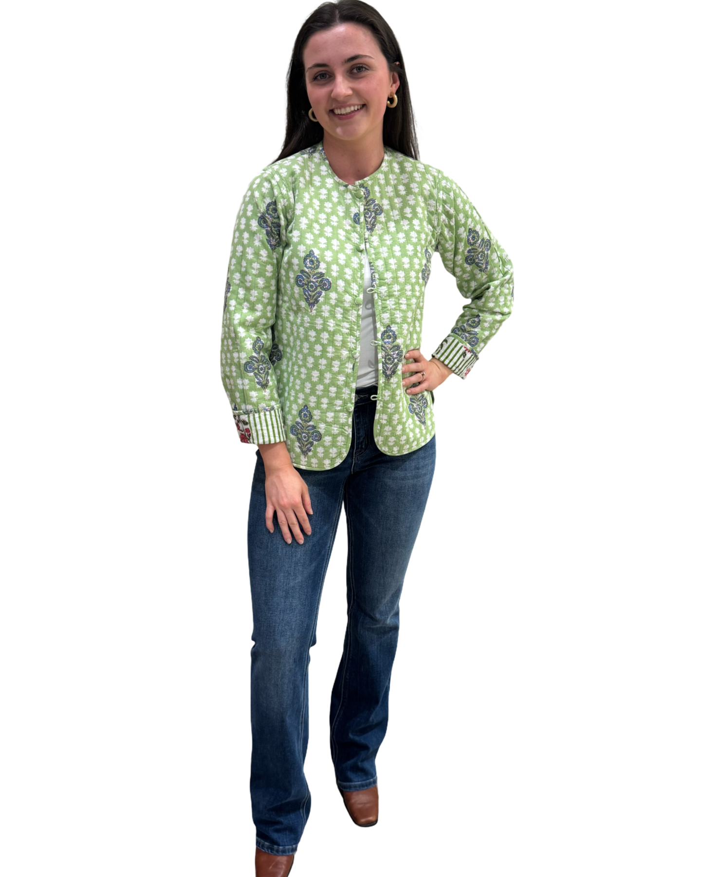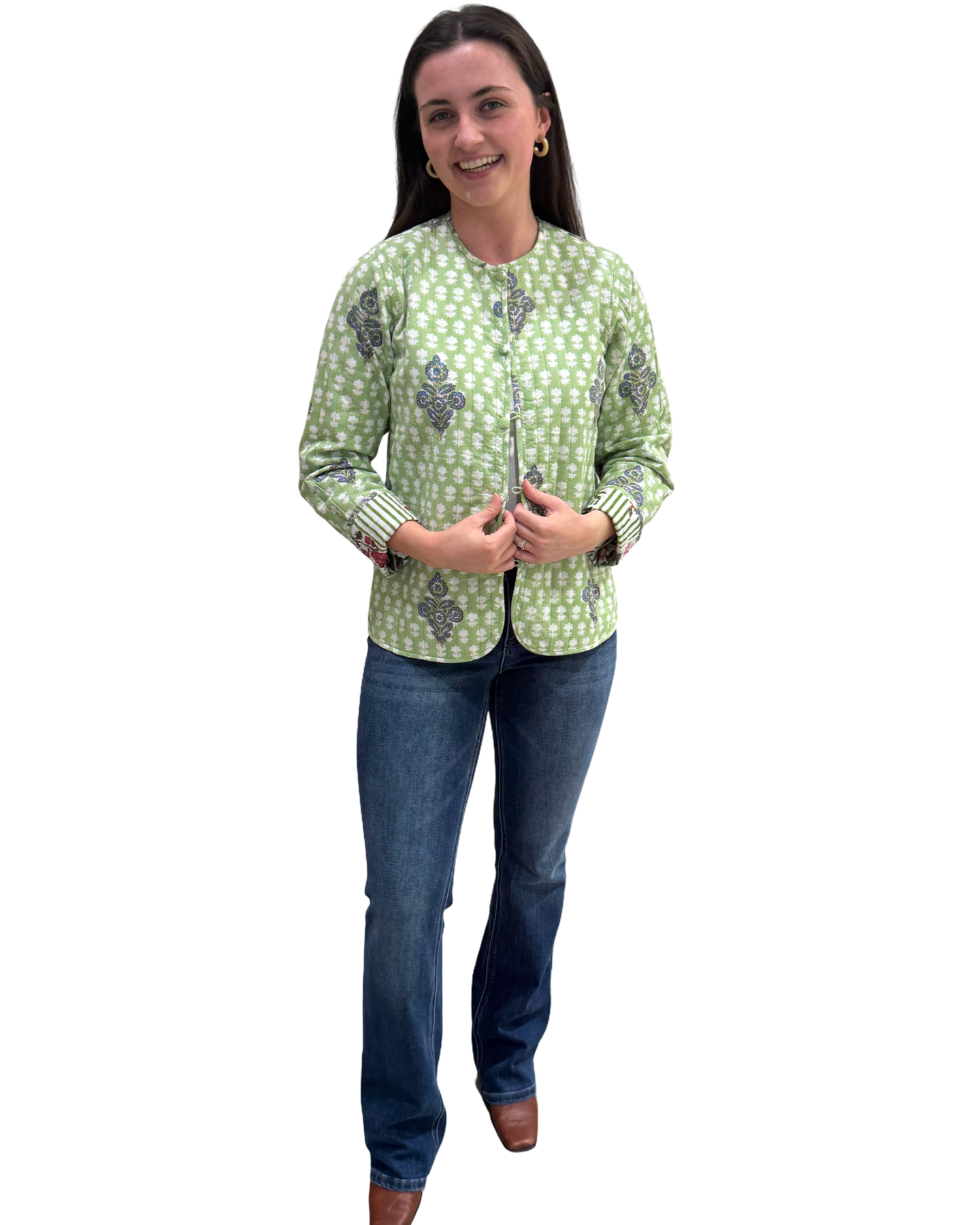 A fun and functional button front reversible jacket. This cotton block printed jacket has self covered buttons and is an adorable throw-on-and-go style. Fold up cuffs add the prefect contrasting accents. Model is 5'8" wearing a size small. Cold gentle wash line dry.
