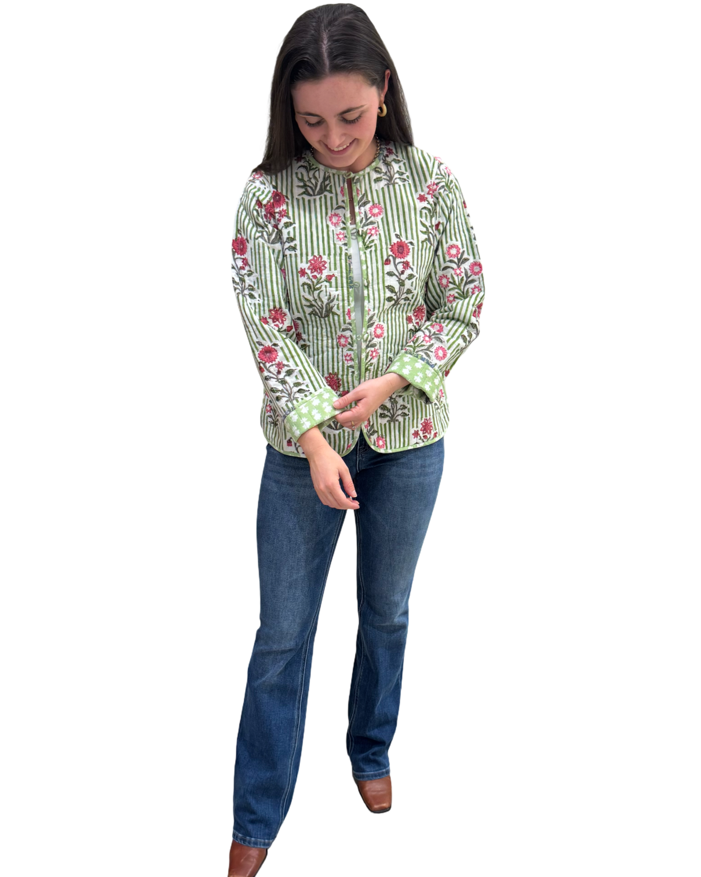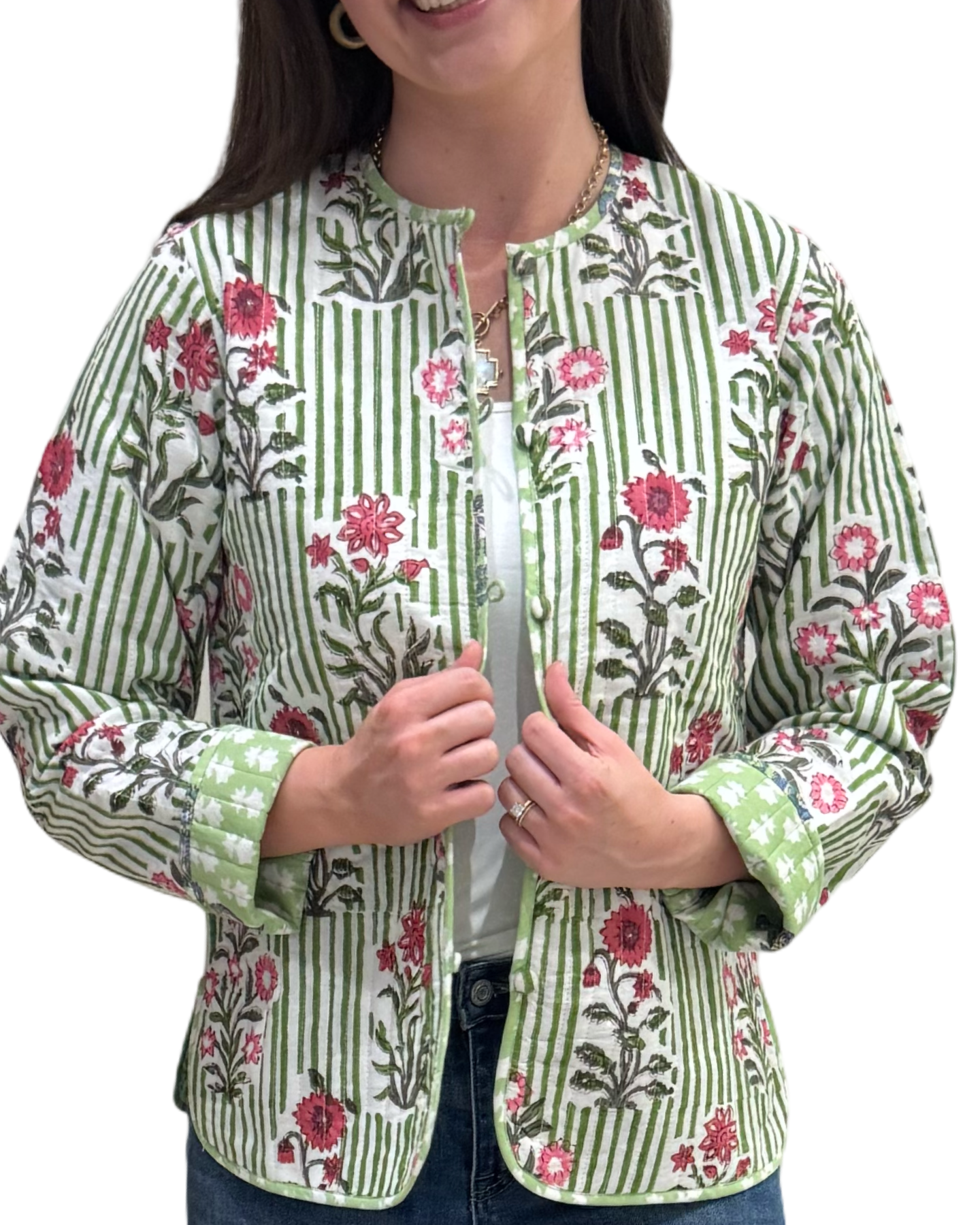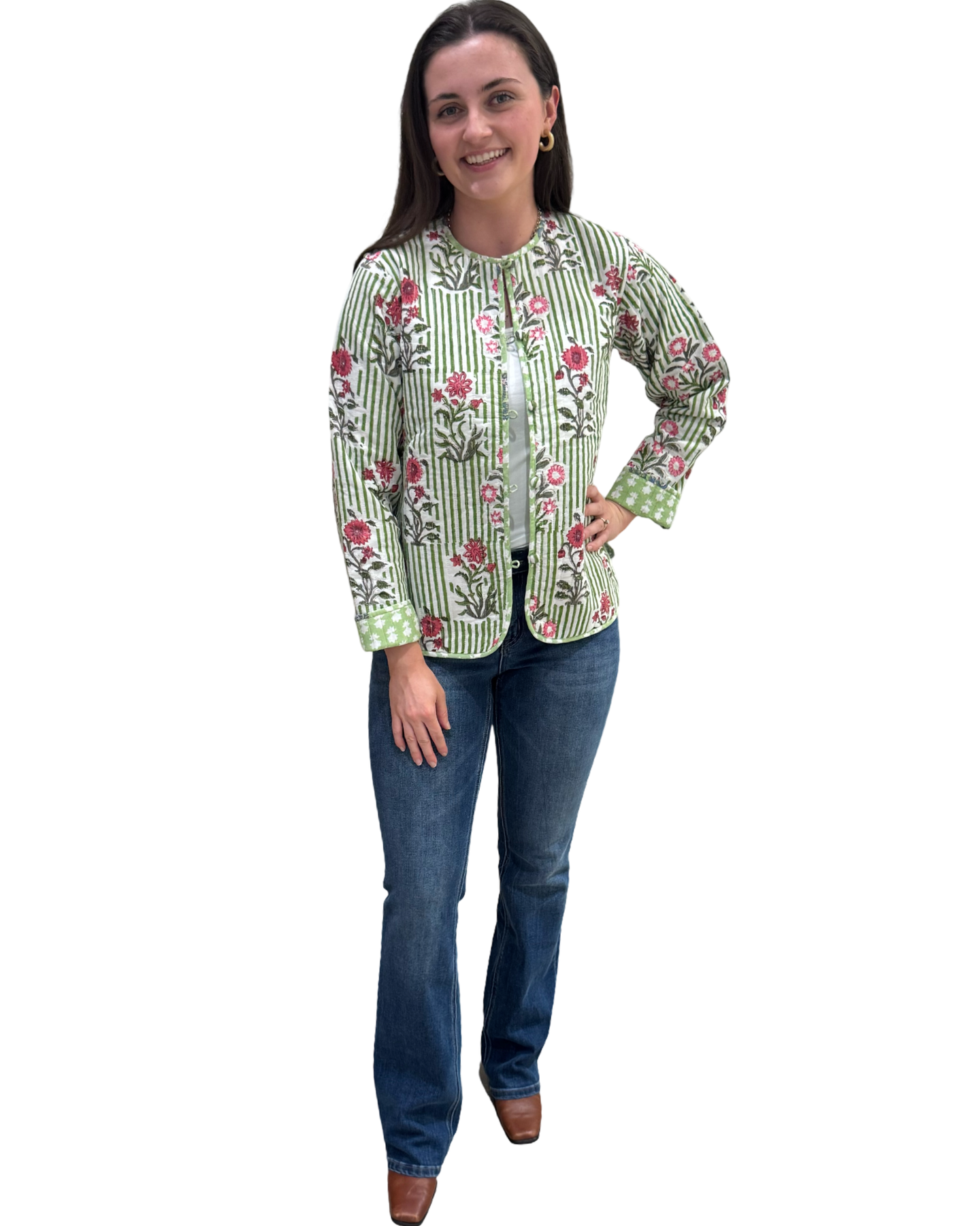 A fun and functional button front reversible jacket. This cotton block printed jacket has self covered buttons and is an adorable throw-on-and-go style. Fold up cuffs add the prefect contrasting accents. Model is 5'8" wearing a size small. Cold gentle wash line dry.