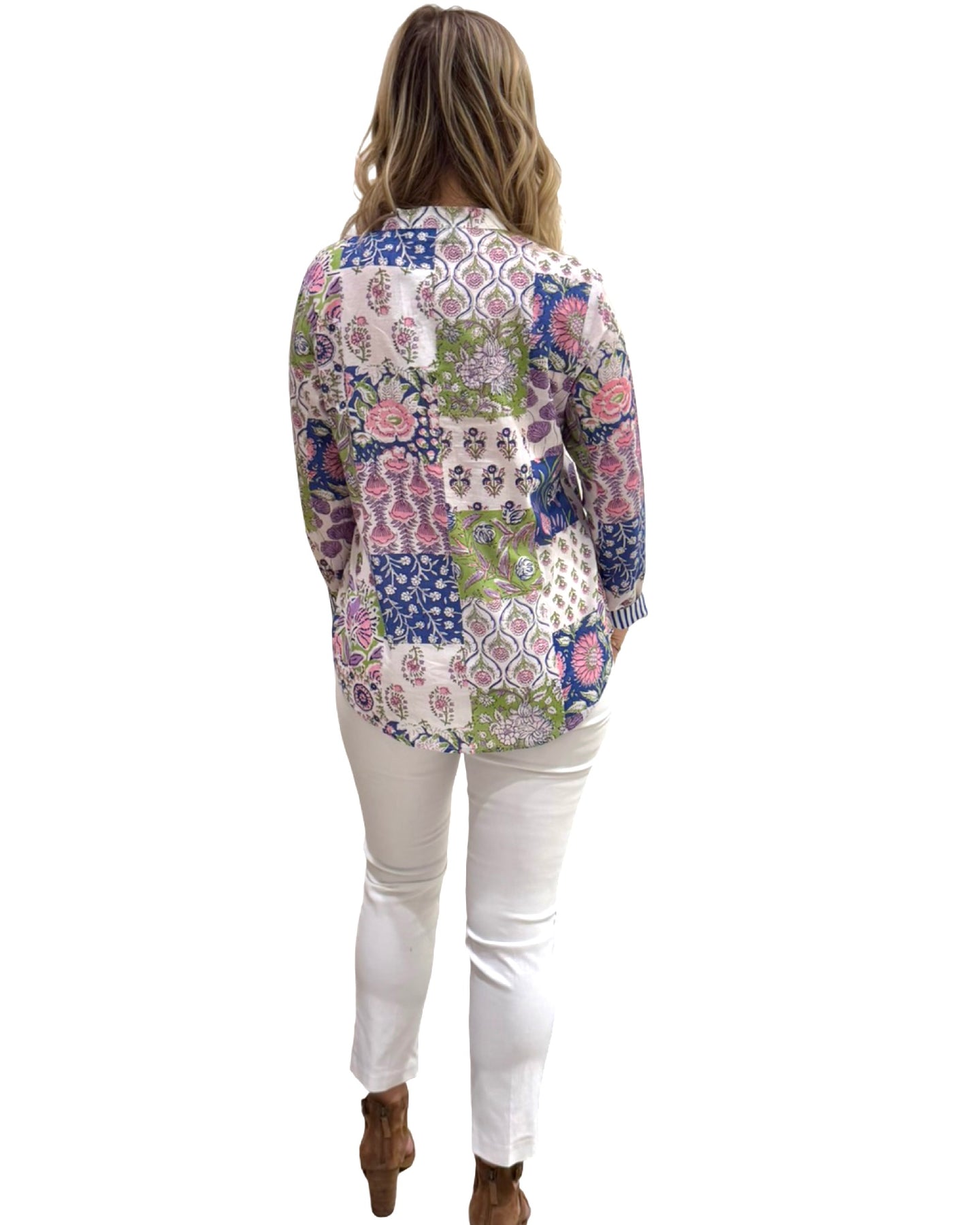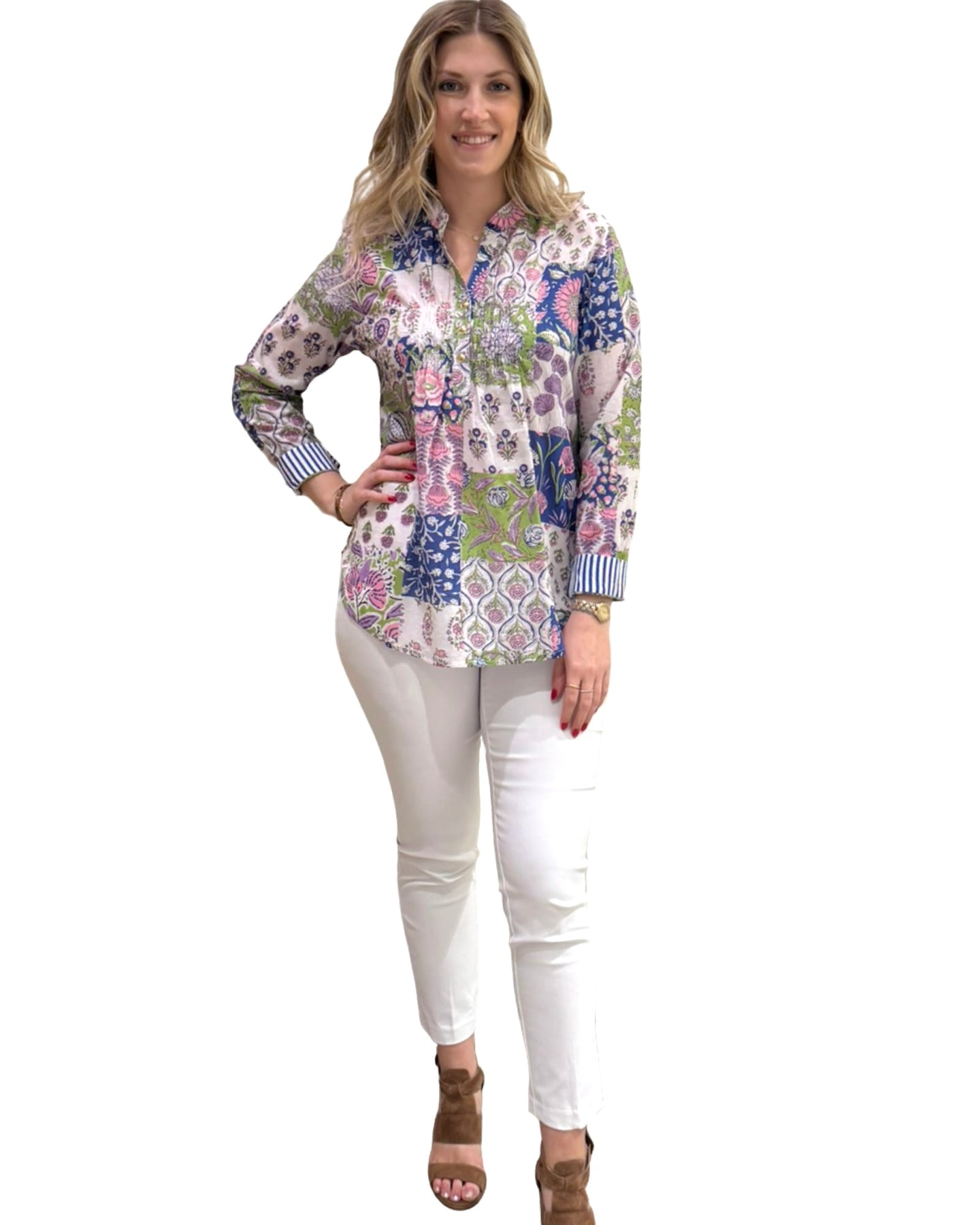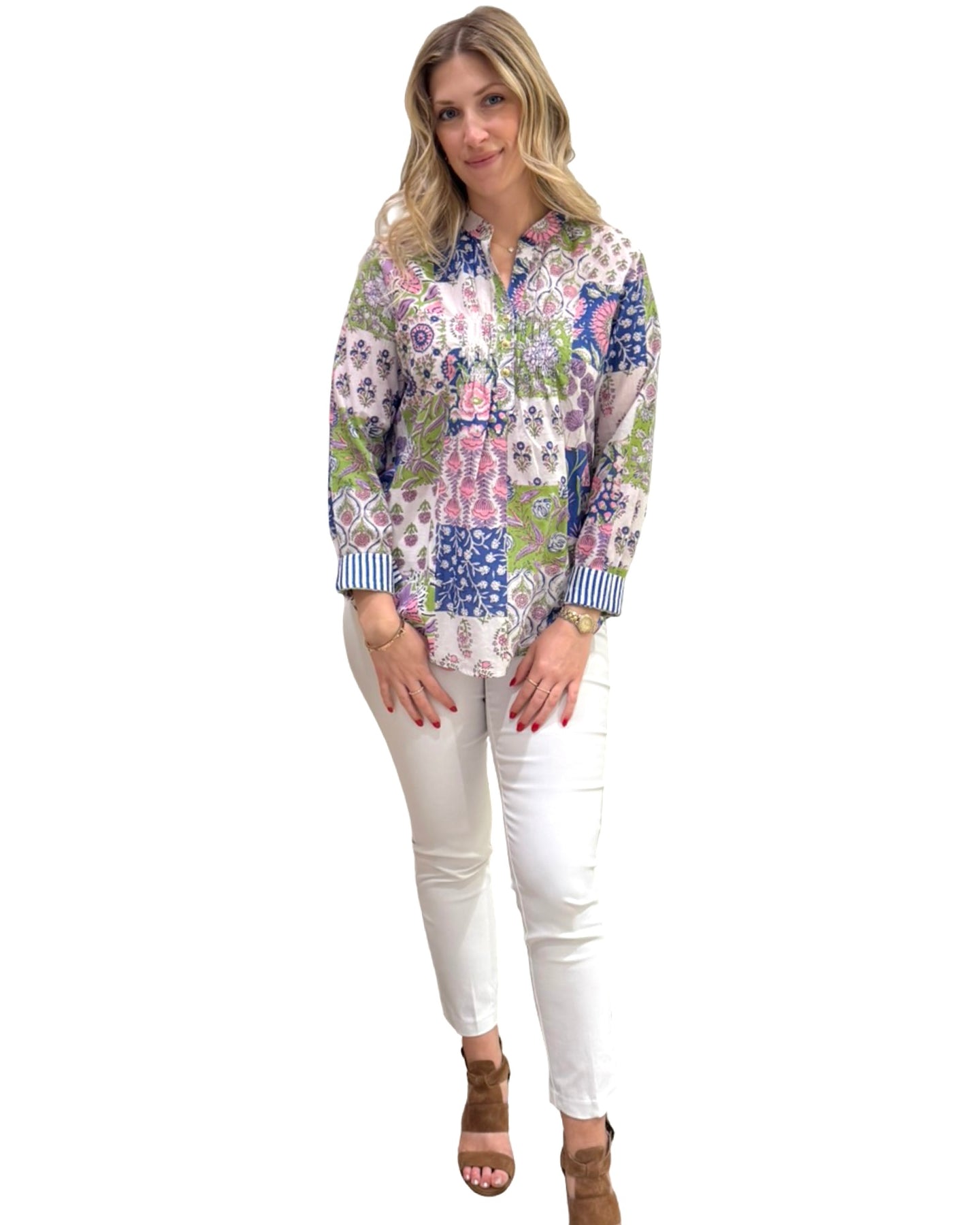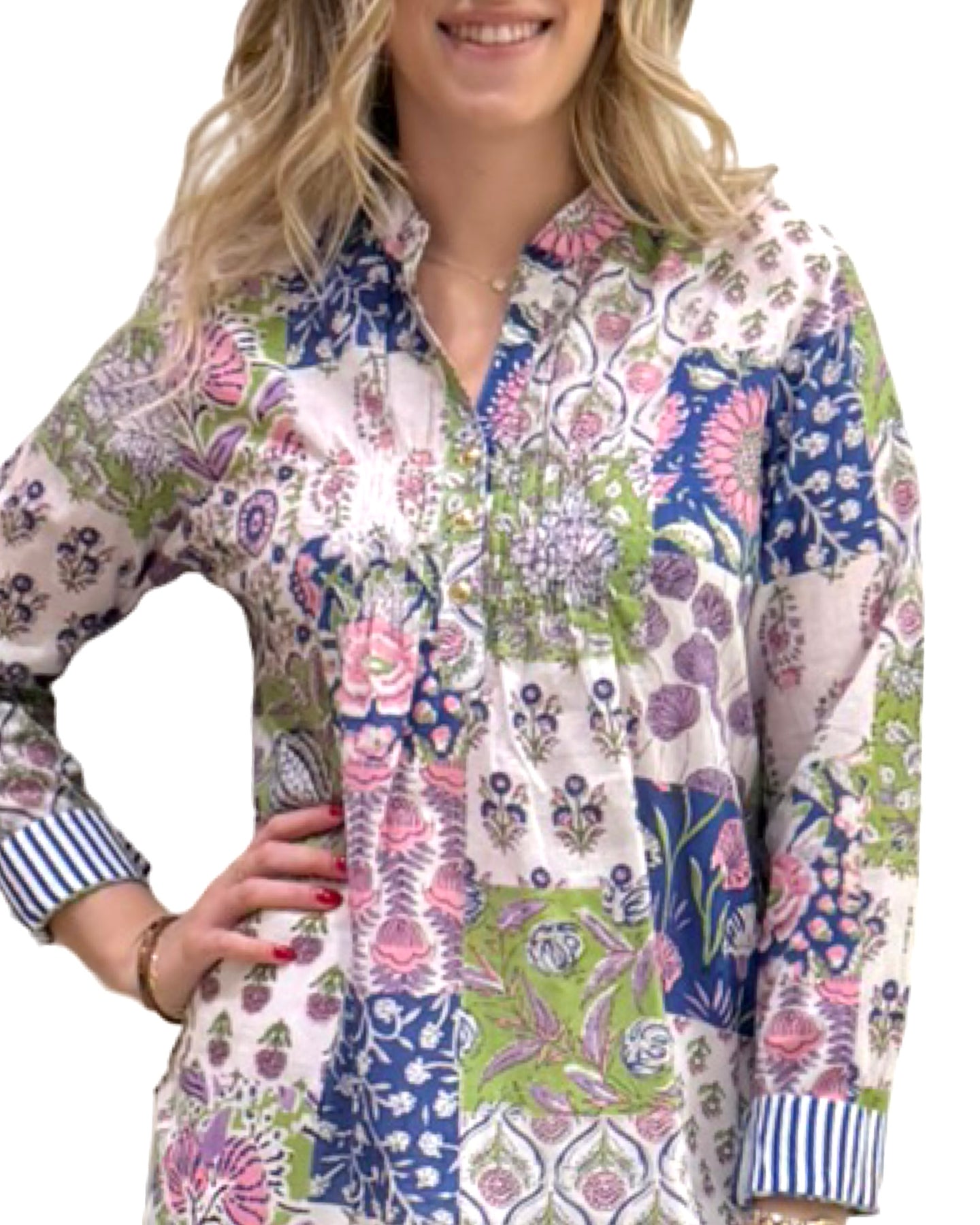 Ladies' cotton top in a blue crabby print combination white with gold buttons and pleated neckline detail. This is an easy silhouette with simple stripe cuff sleeves. Pair this with khakis, white pants or jeans for your relaxed year-round style. Model is 5'9” wearing a size small. Cold gentle cycle wash line dry.