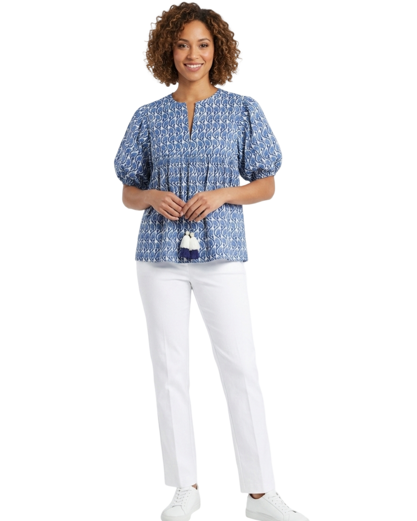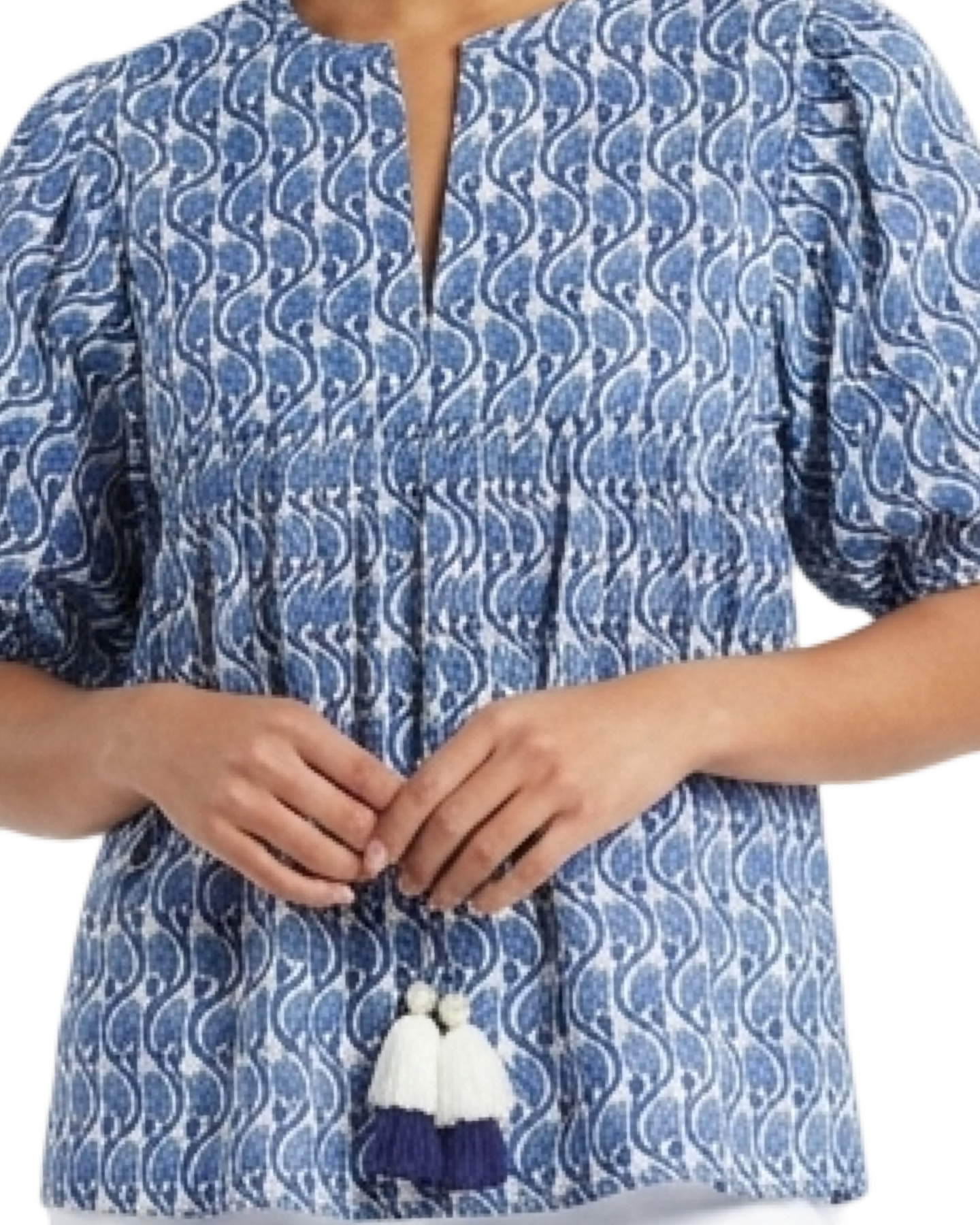 A fun and functional hand-blocked floral cotton top. Tassel tie v-neck style detailing makes for an easy-to-wear fun in the sun style. Cold hand wash, line dry. Model is 5'7 wearing a size x-small.