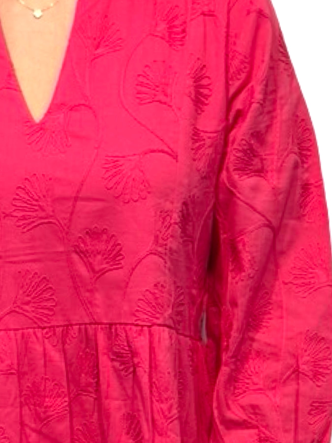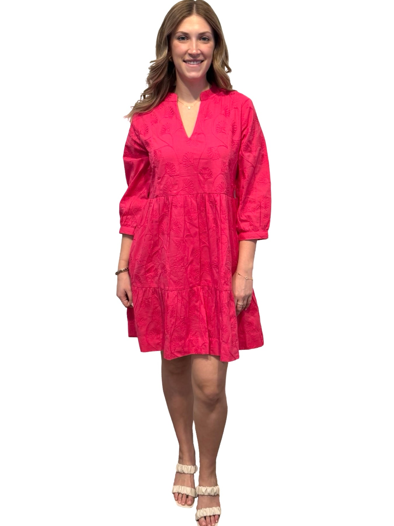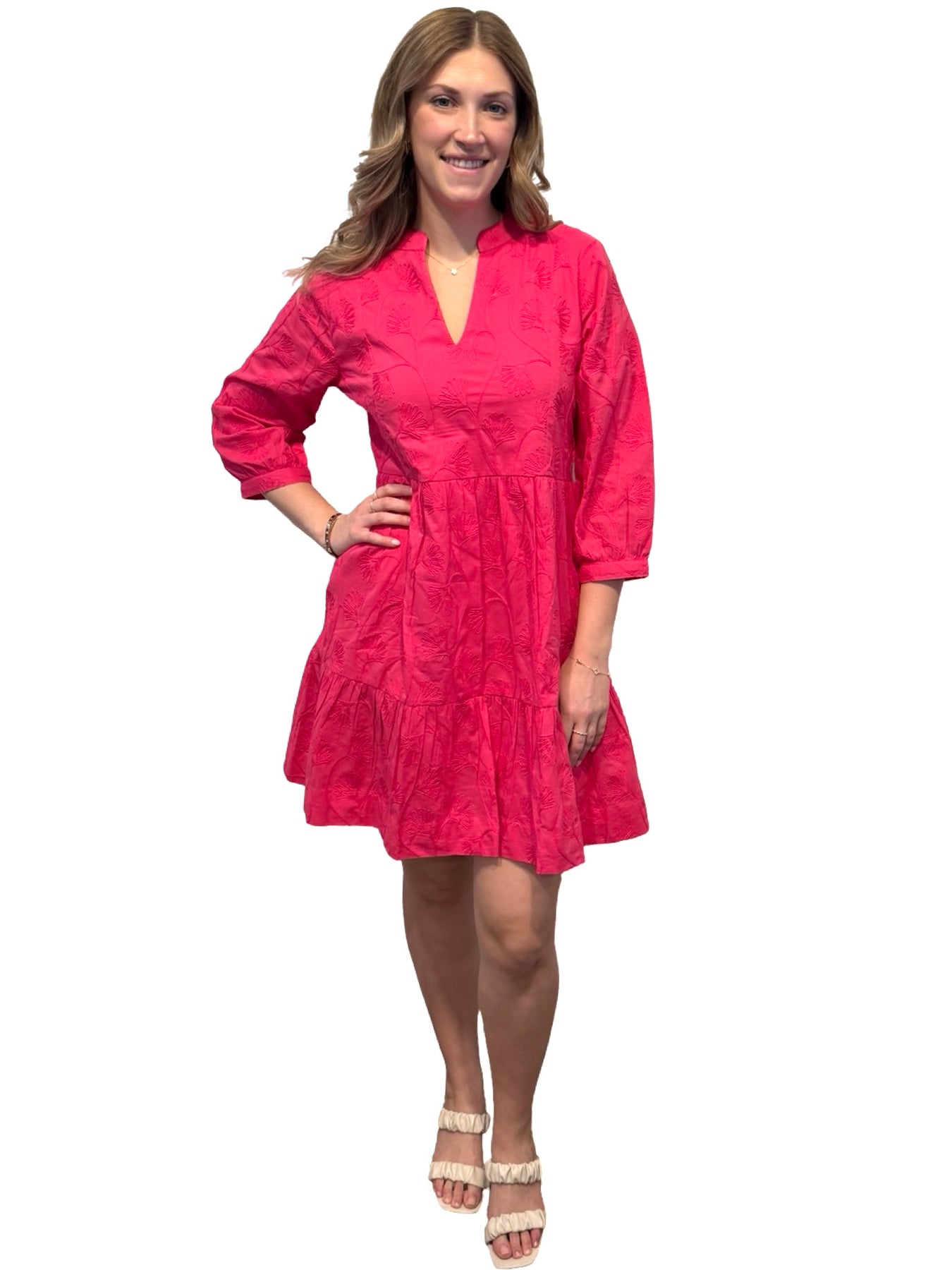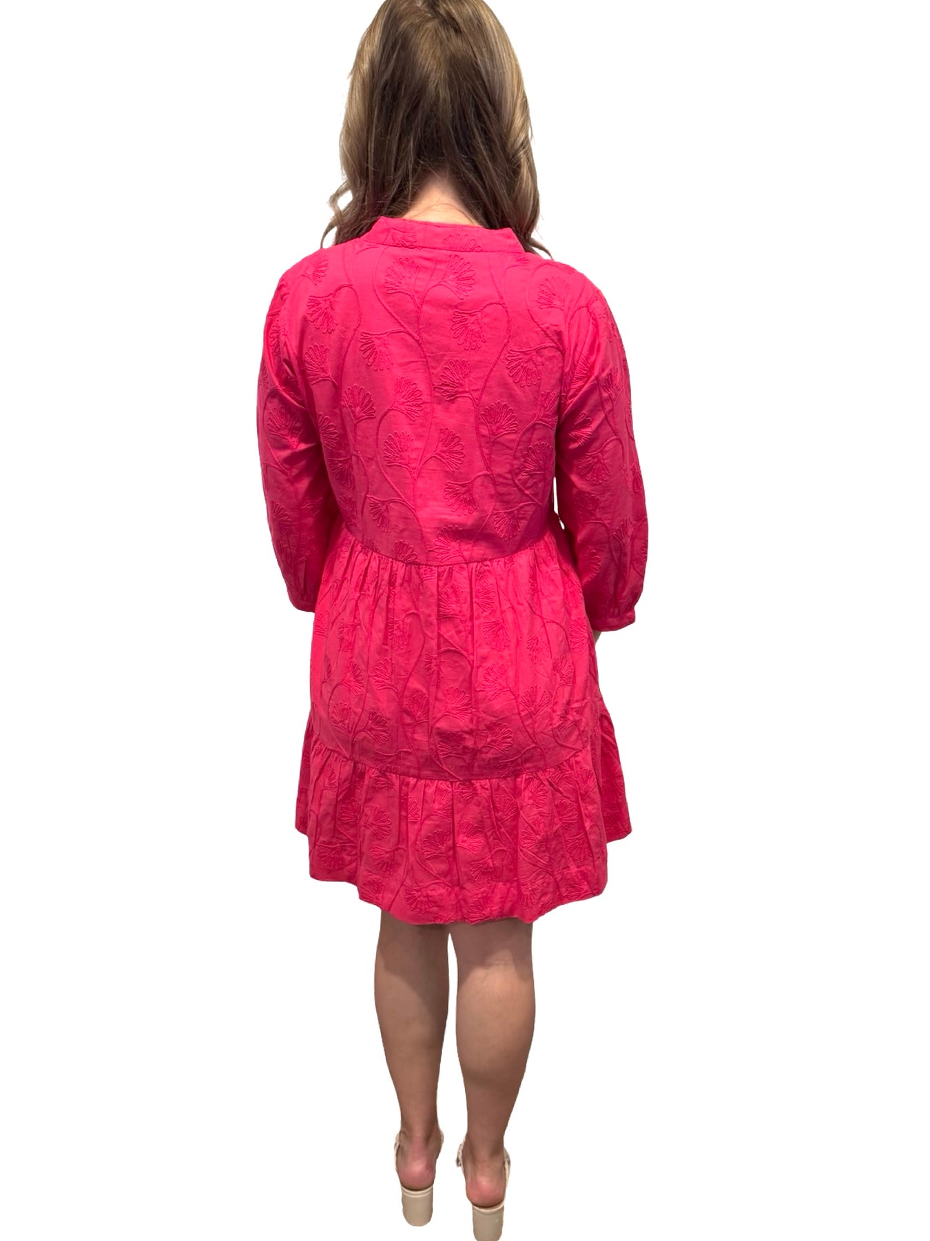 An easy over-the-head 3/4 sleeve side pocket dress. A unique cotton embroidered fabric design on cotton, this lined dress is a perfect style to wear year-round for day to night activities. Model is 5'9” wearing a size small. Cold hand wash line dry.