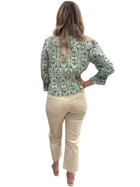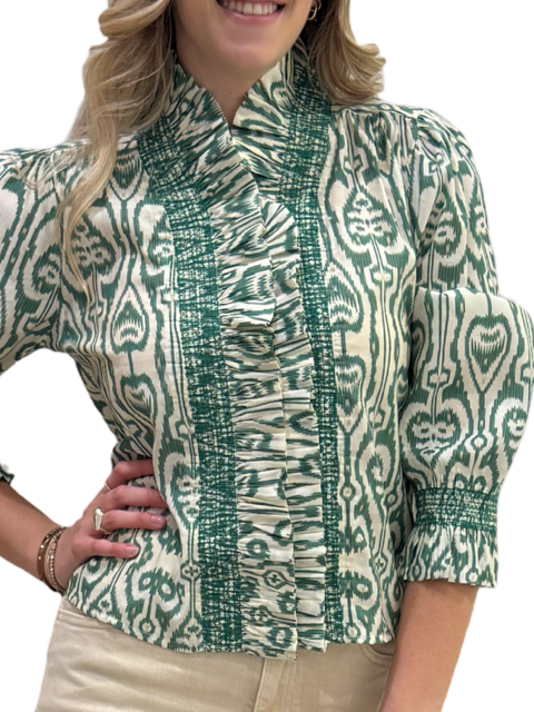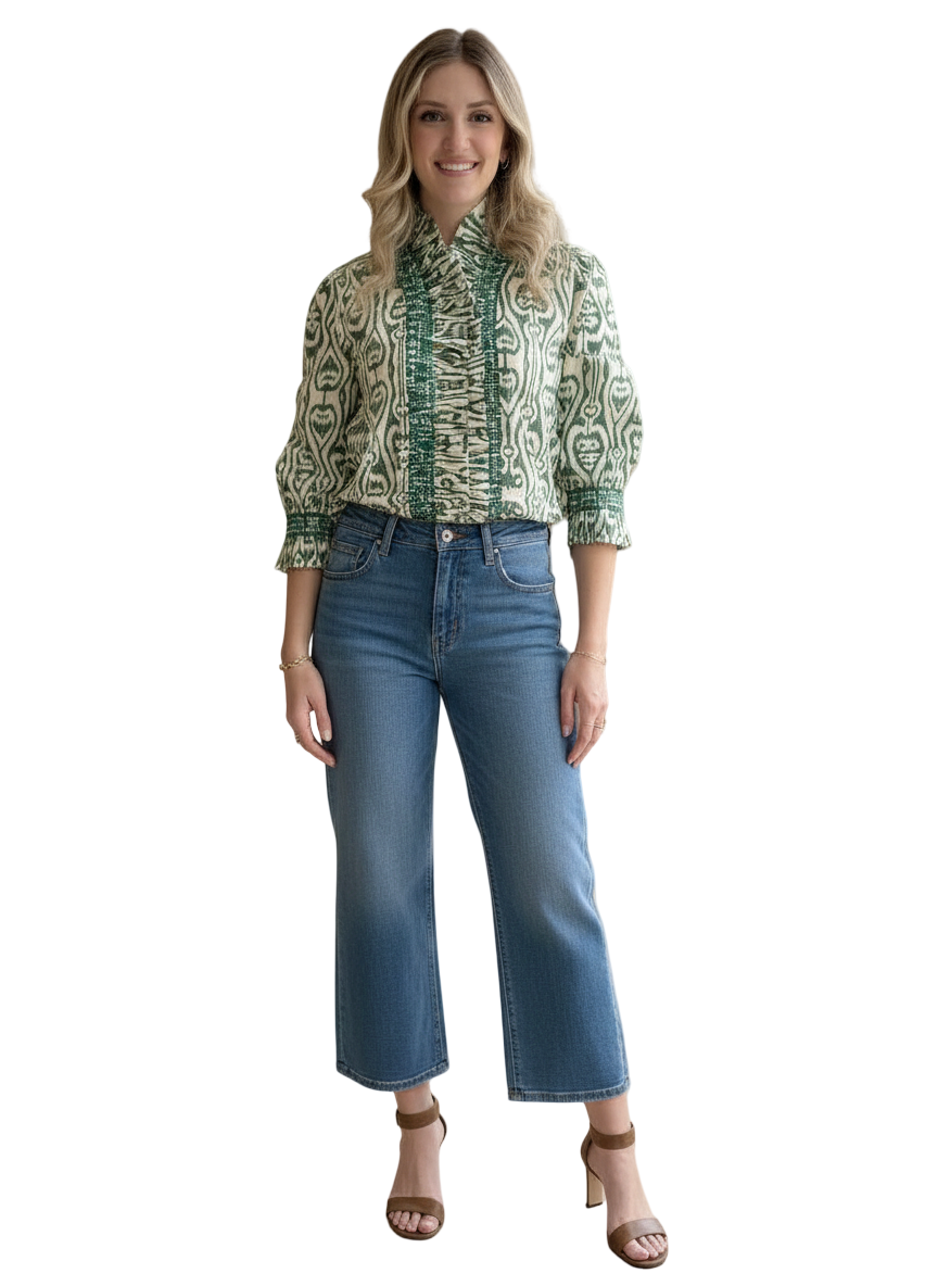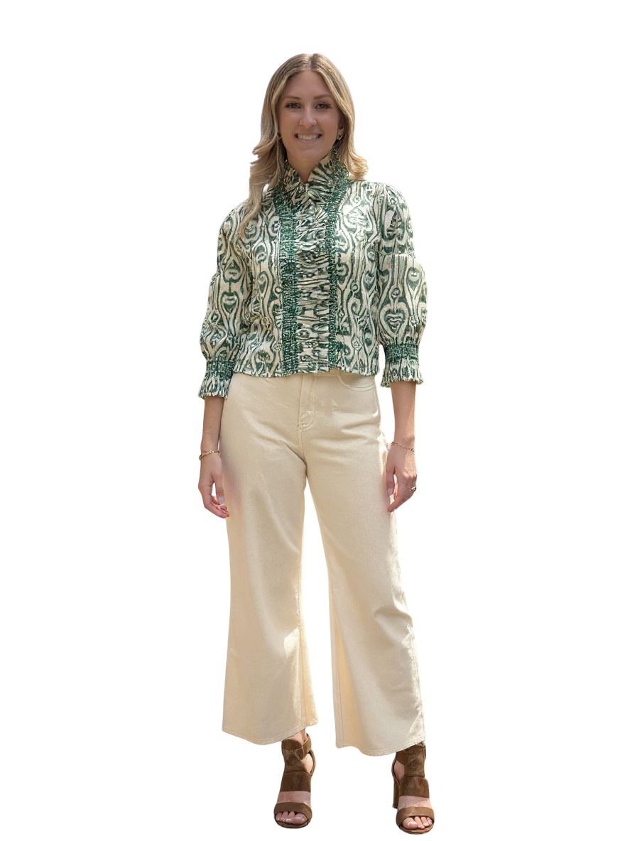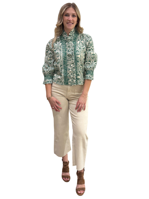 The Amelia Ruffle Trim Smocked Top in Moss Green White Ikat