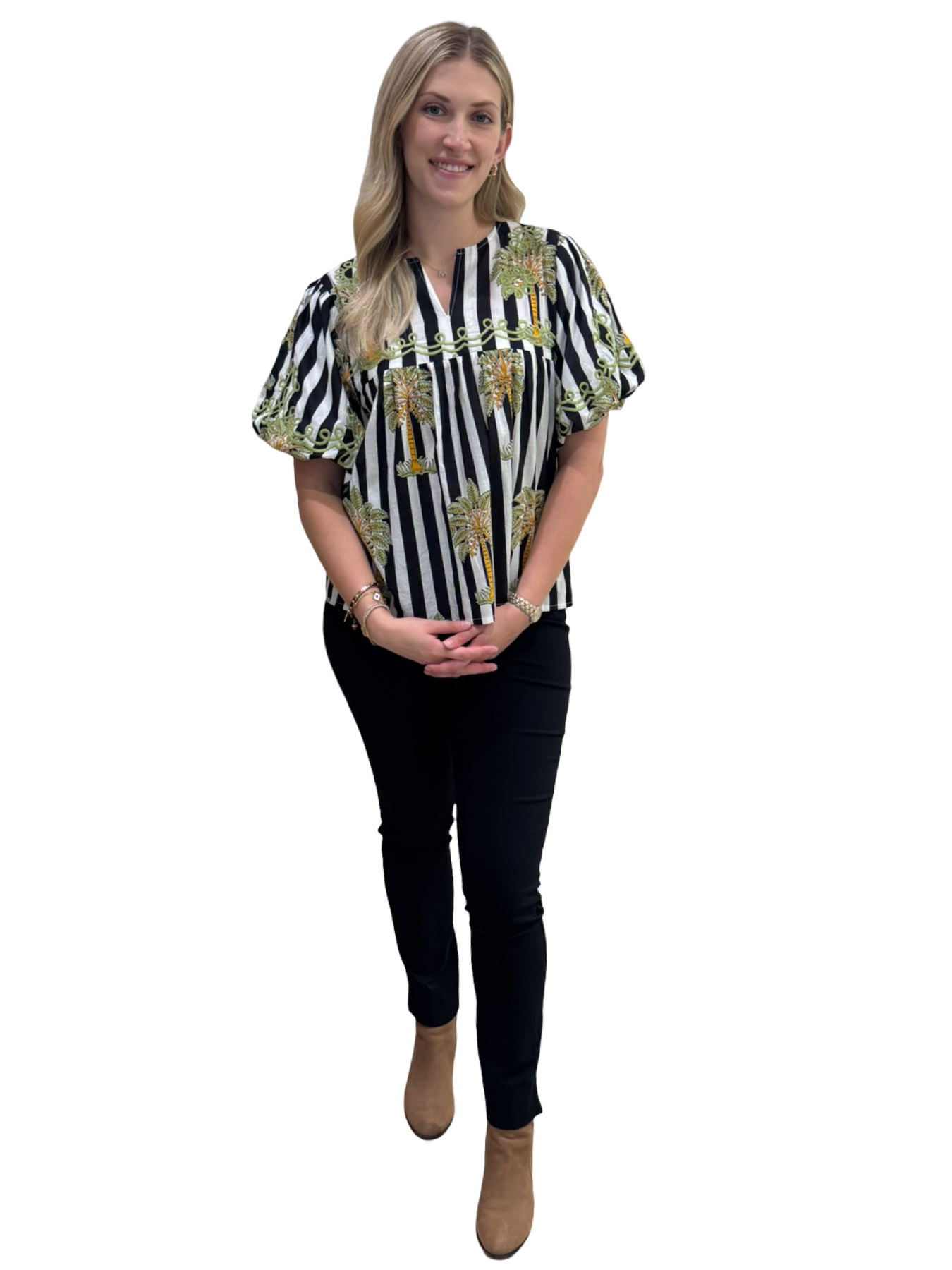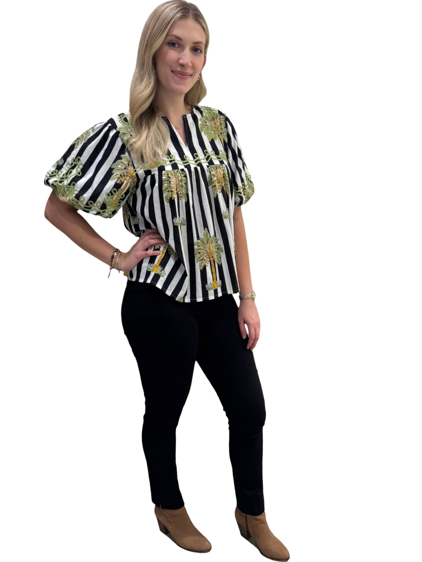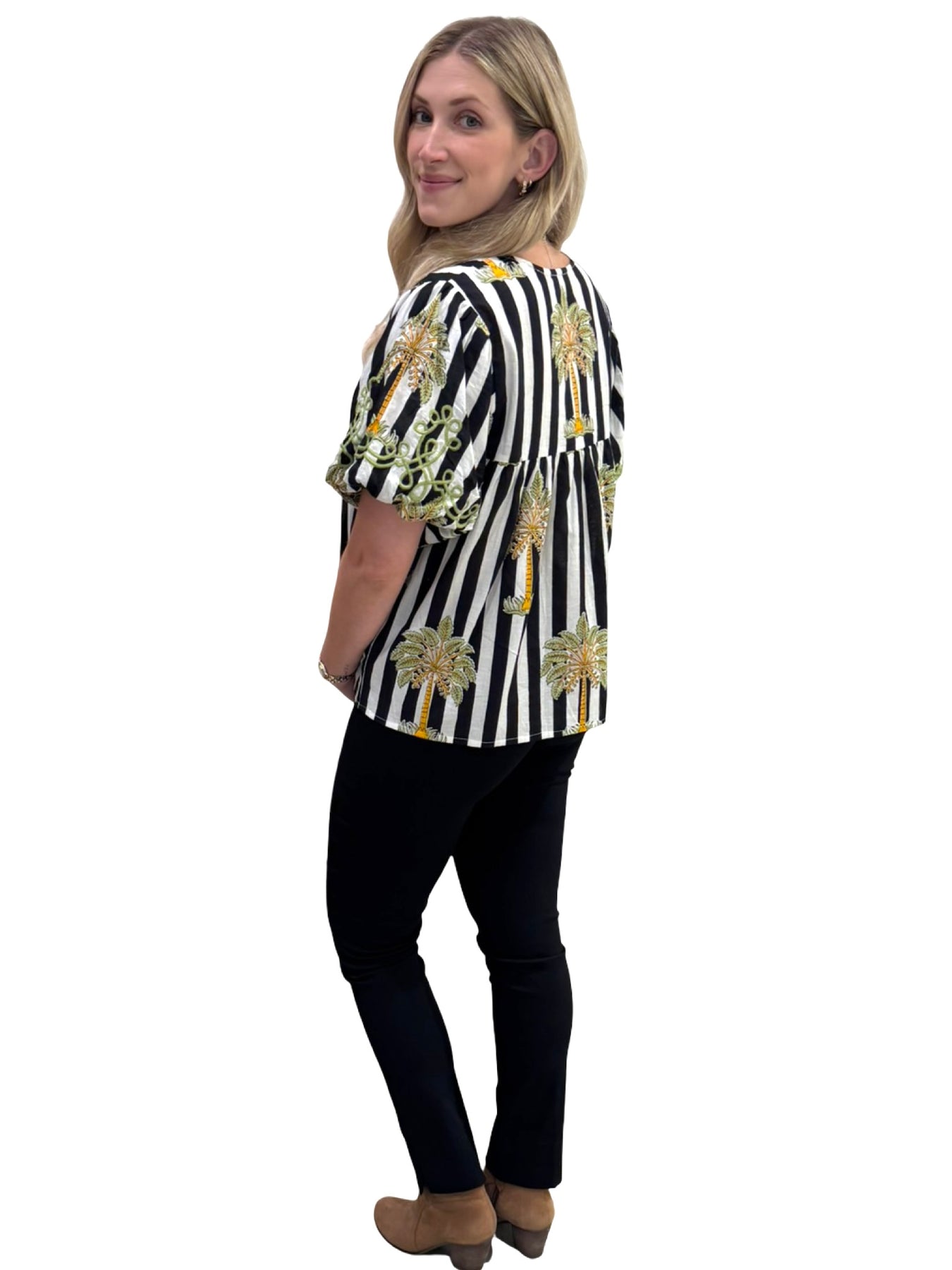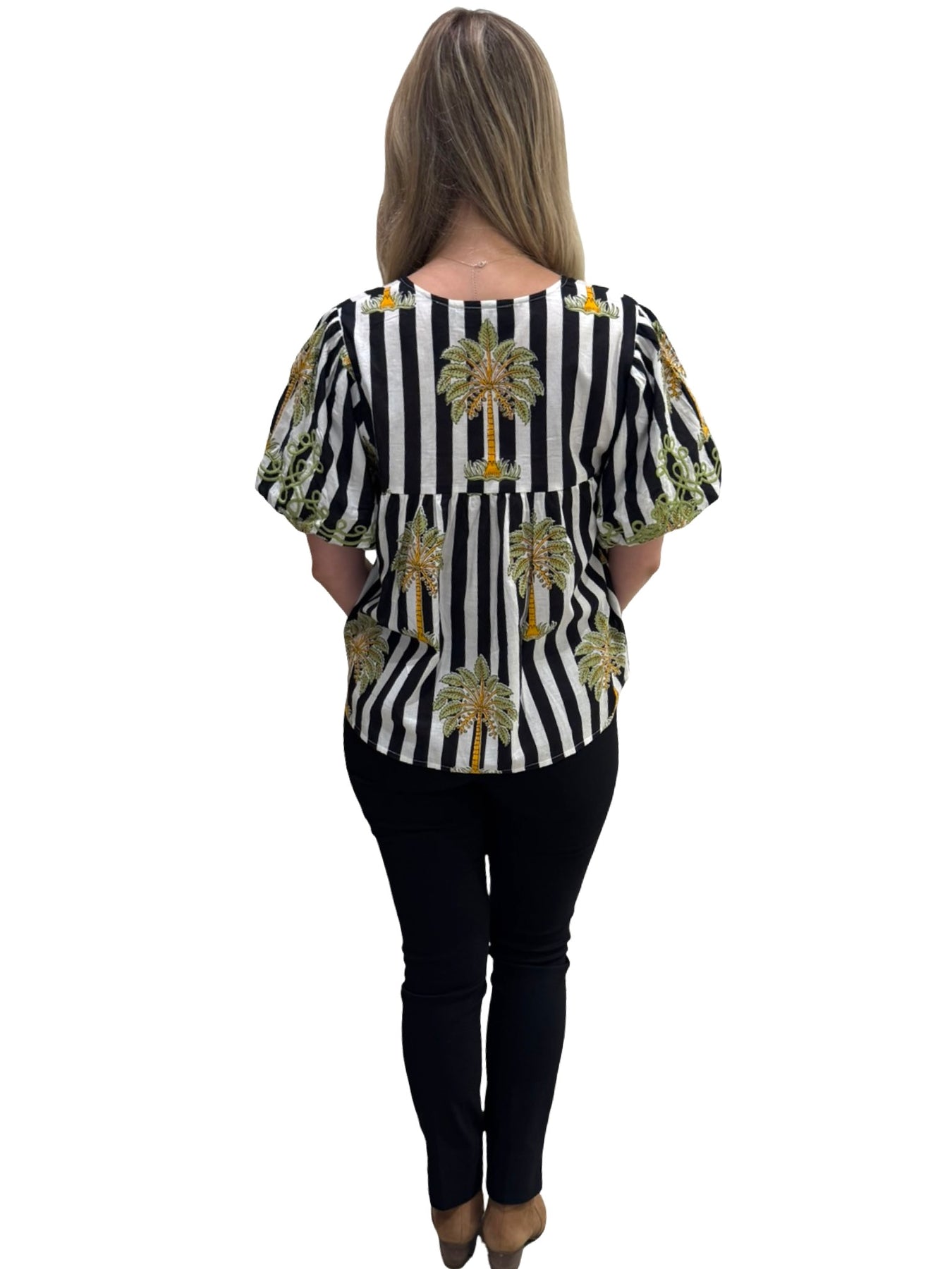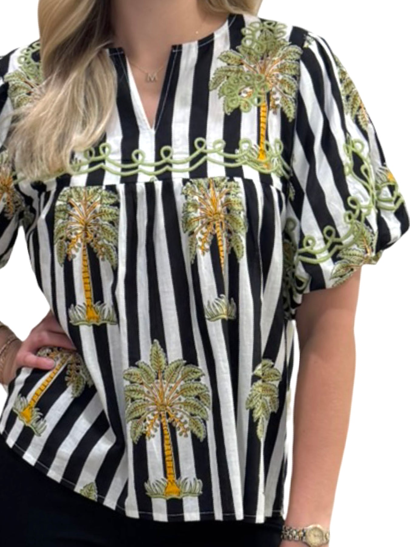 A fun and functional hand-blocked striped palm print cotton short sleeve top. Embroidered detailing makes for an easy-to-wear year-round piece. Cold hand wash, line dry. Model is 5'9 wearing a size small.