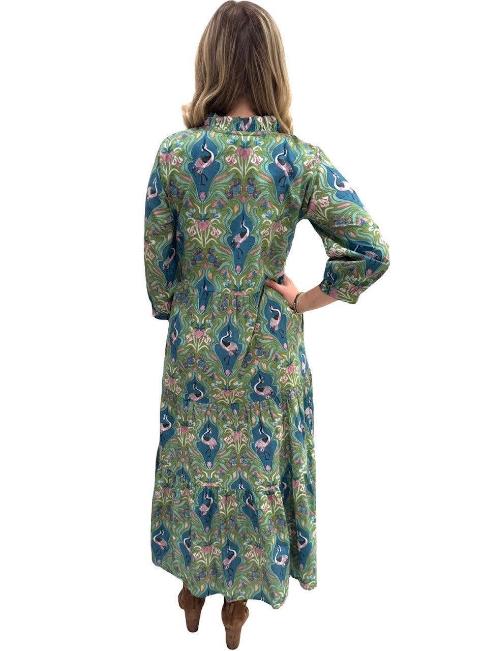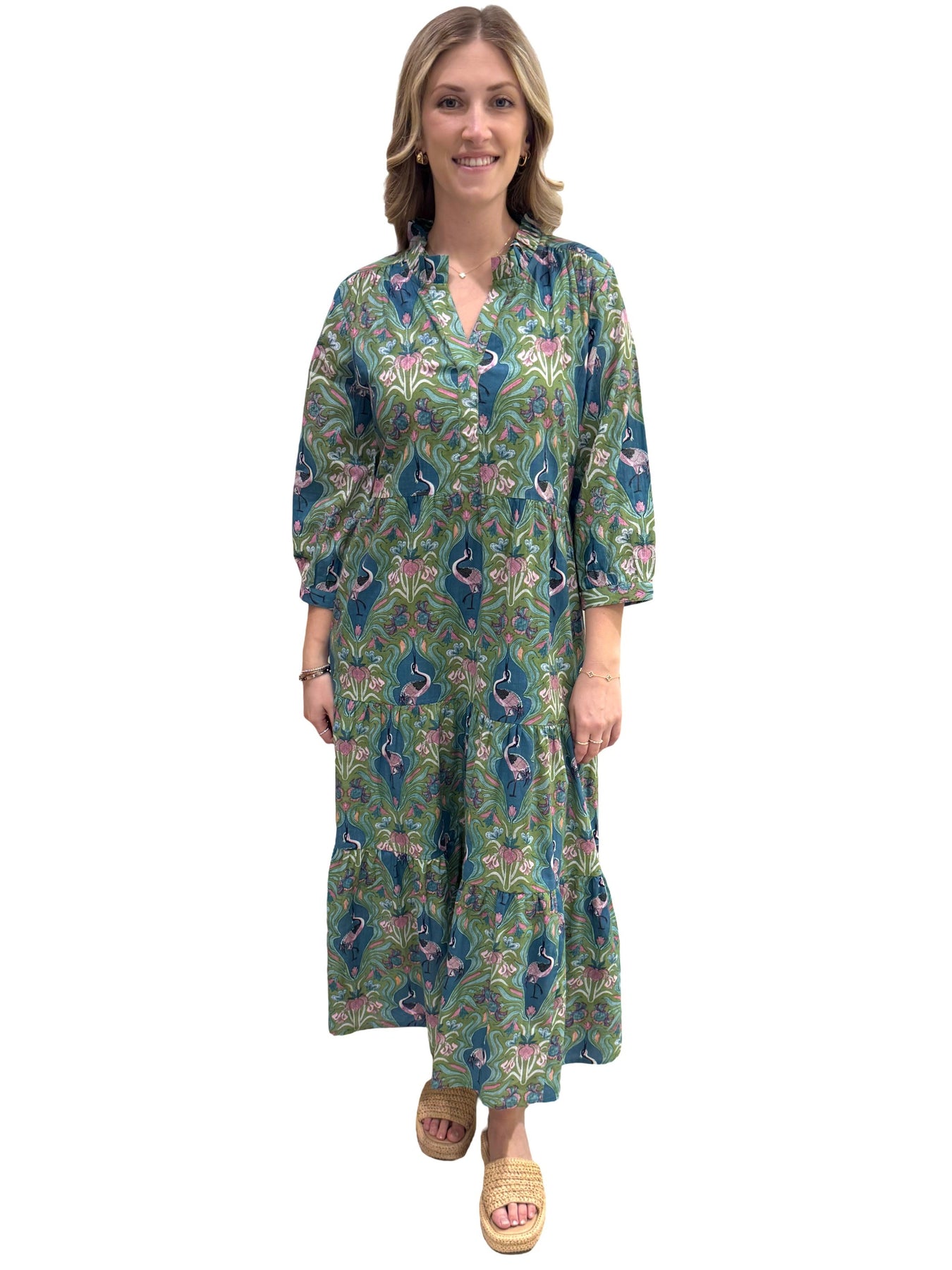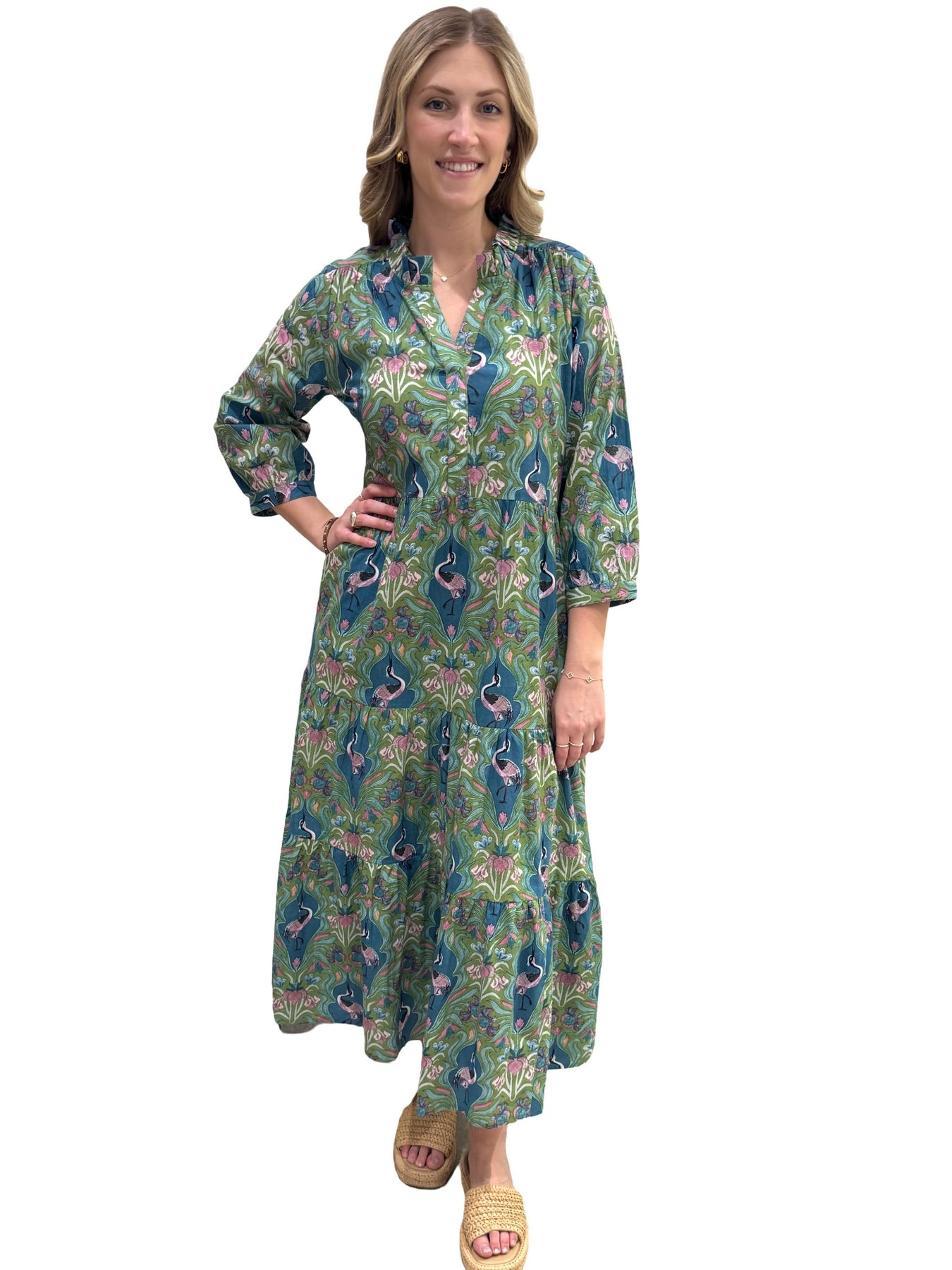 An easy to wear soft cotton 3/4 sleeve dress with ruffle detailing. A perfect side pocket dress in a unique print for a bridal luncheon or evening soiree. Long length with a flattering cut.