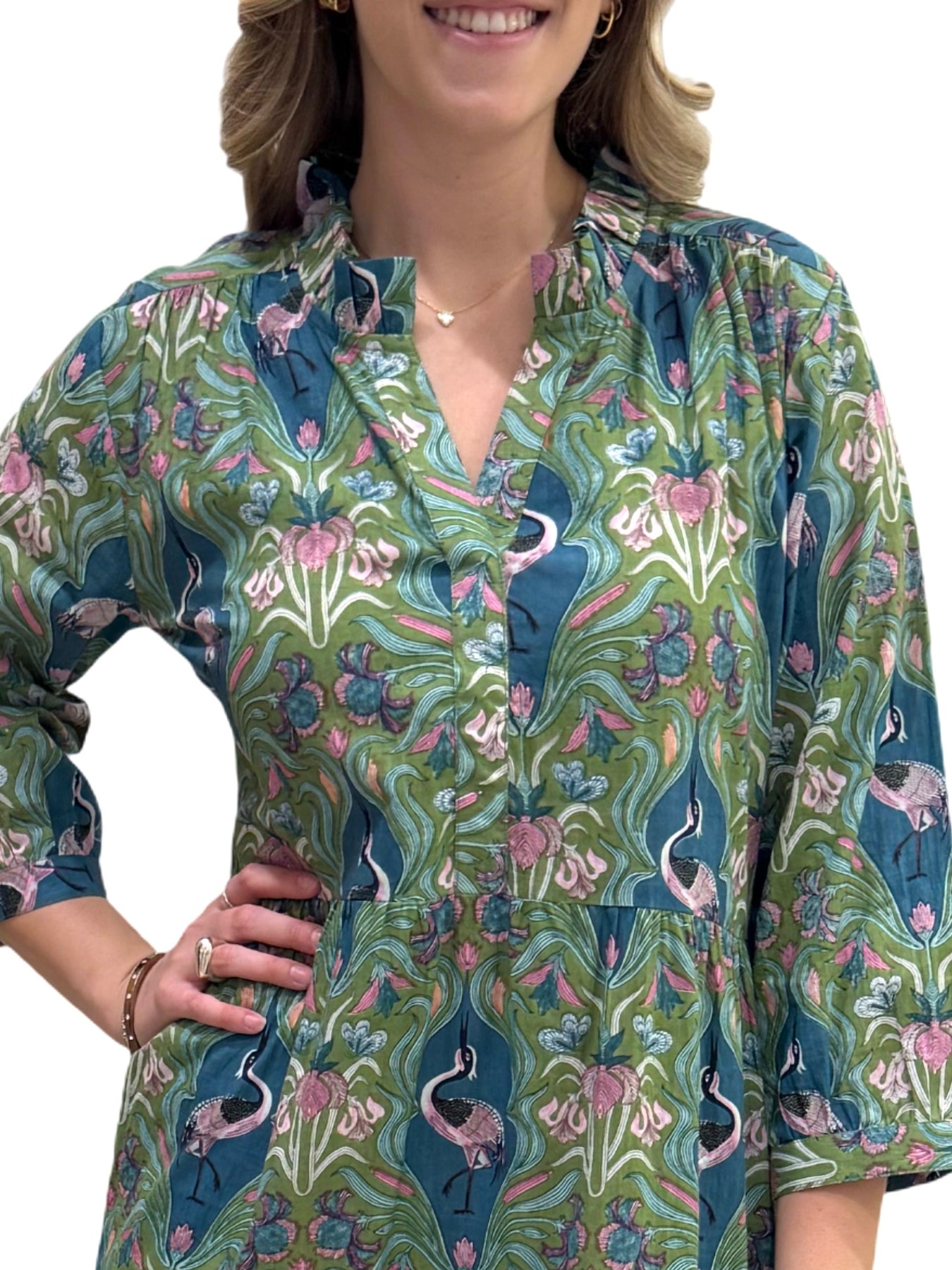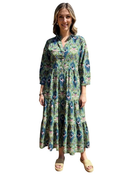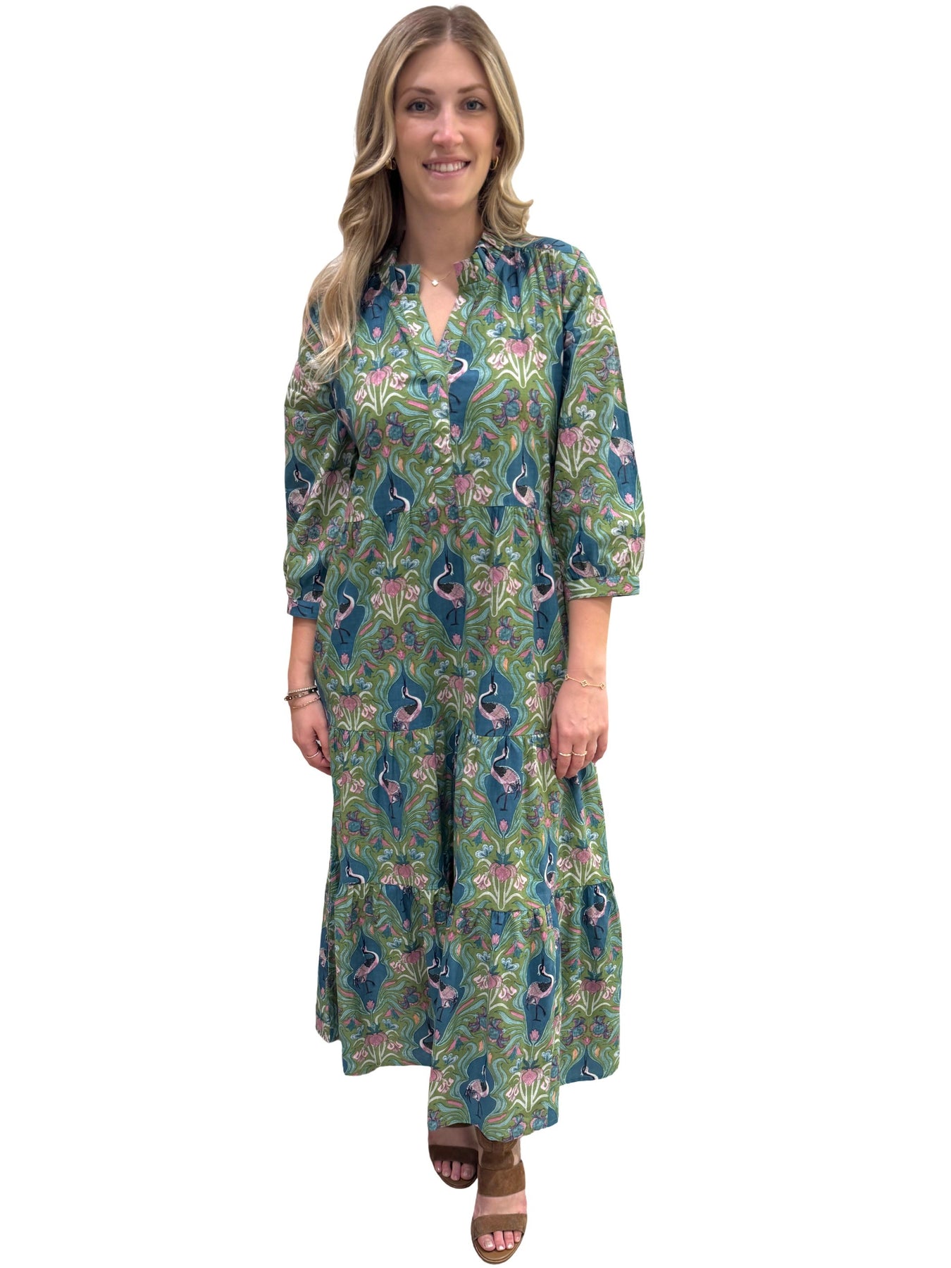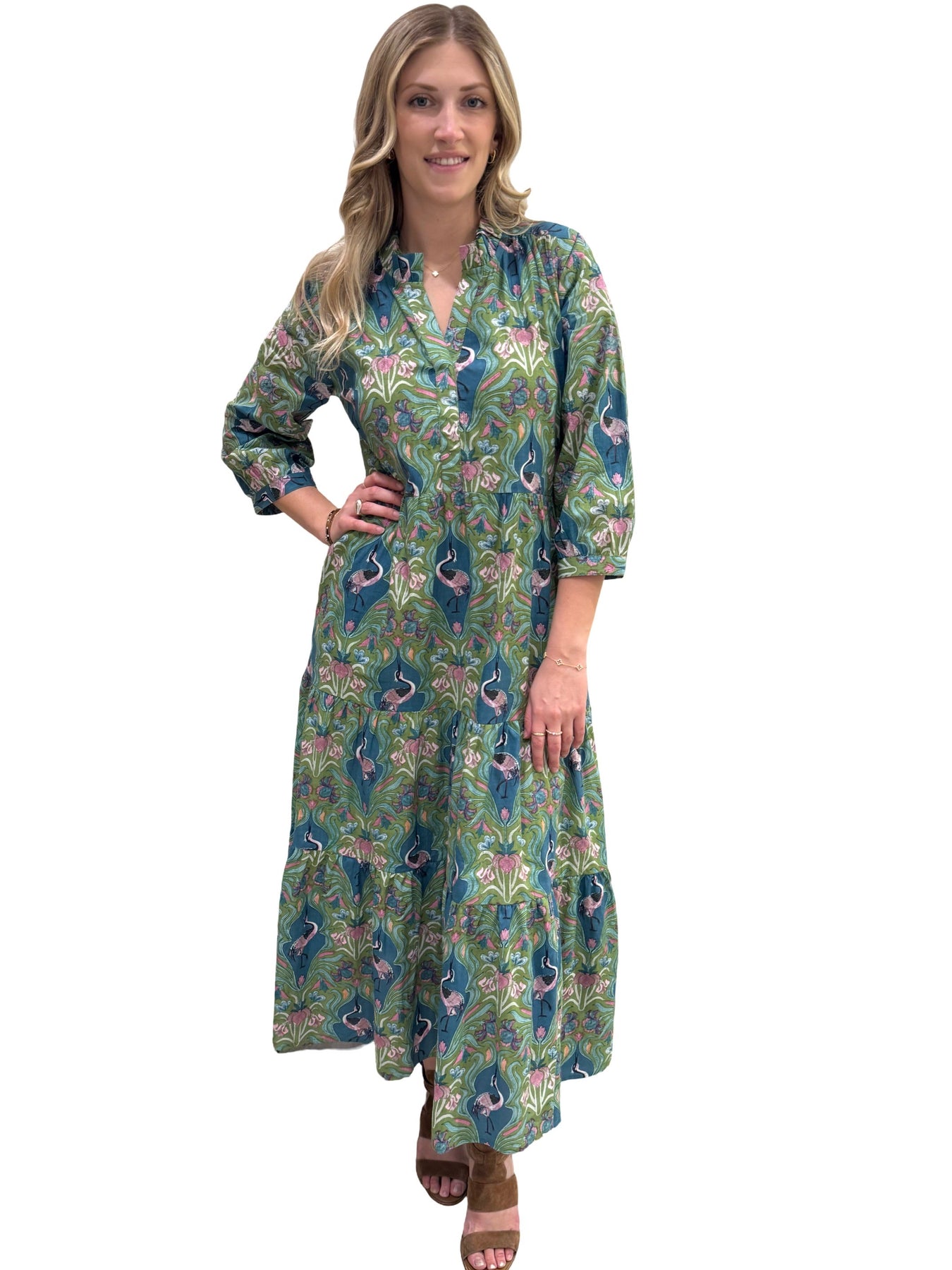 An easy to wear soft cotton 3/4 sleeve dress with ruffle detailing. A perfect side pocket dress in a unique print for a bridal luncheon or evening soiree. Long length with a flattering cut.