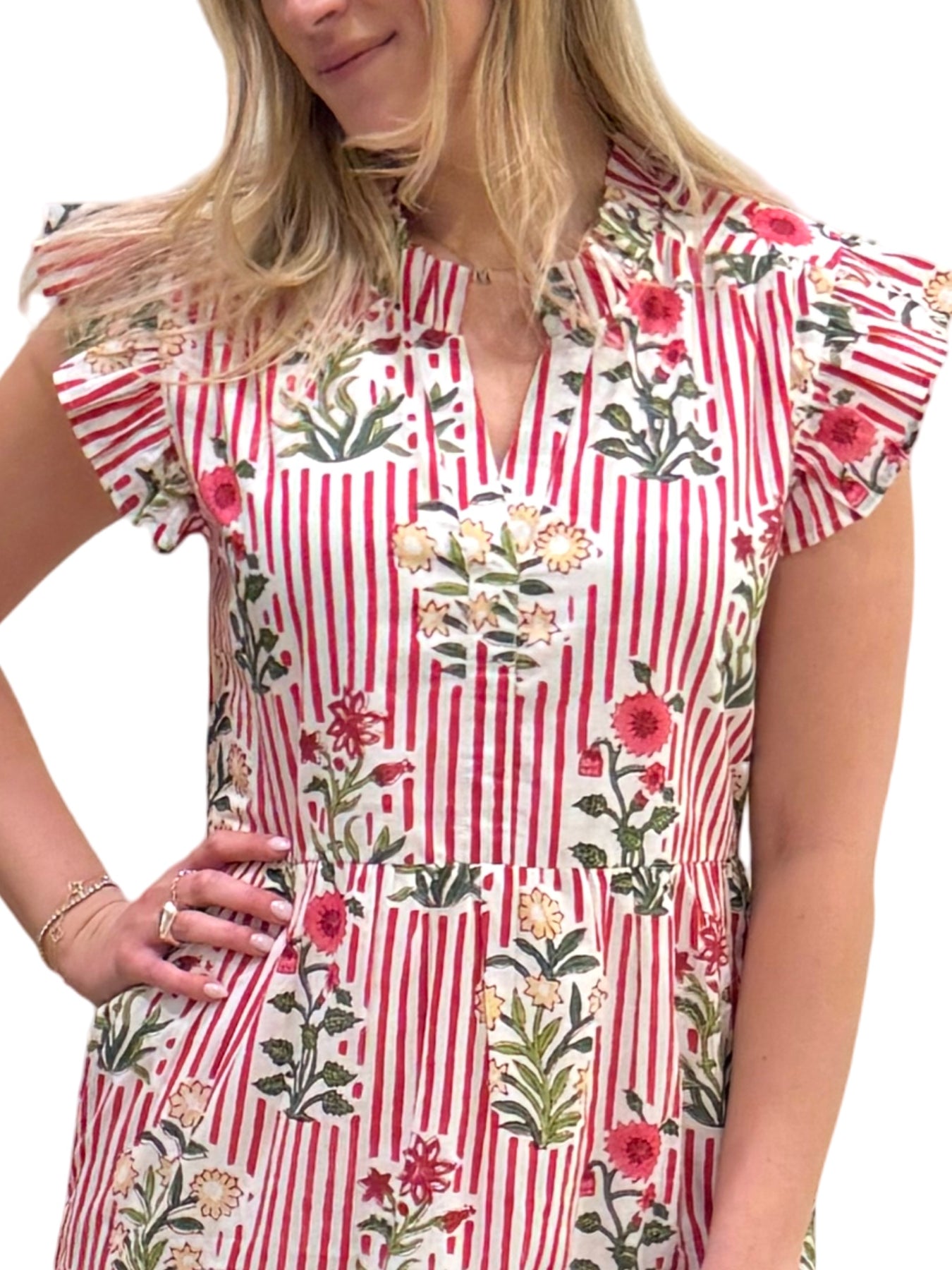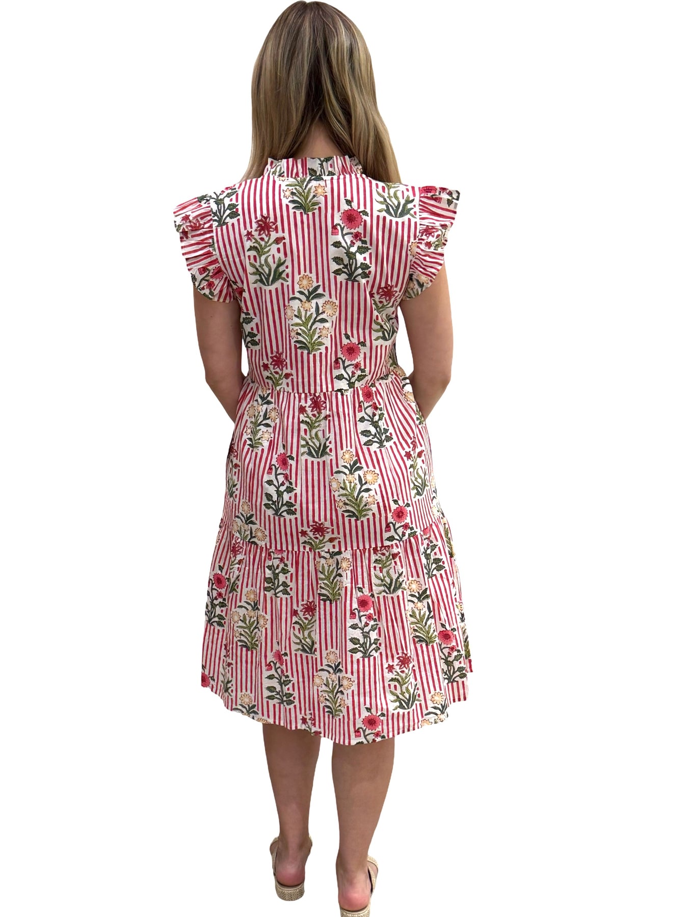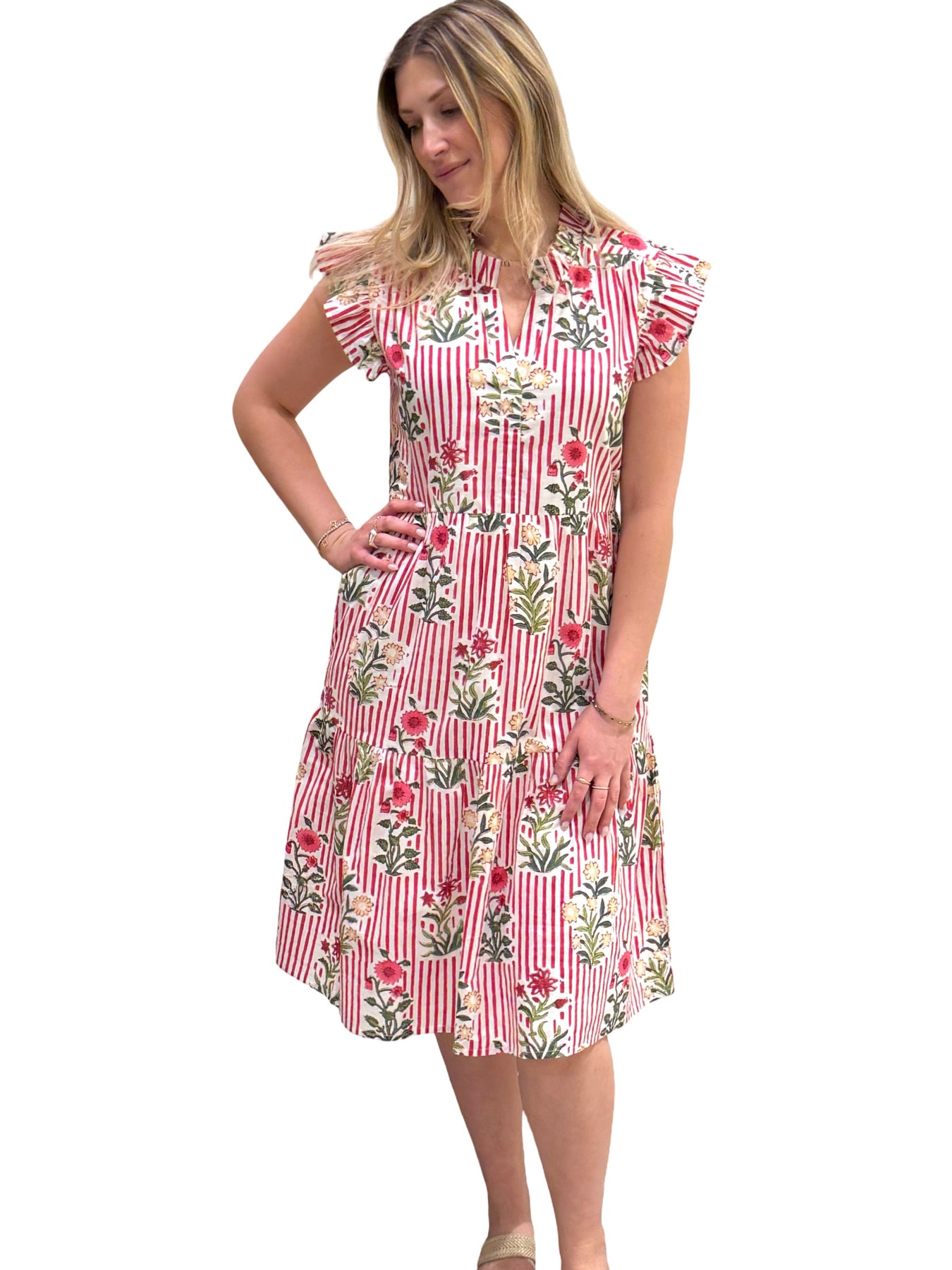 An easy to wear cotton print dress with complimentary stripe ruffle detailing. A perfect lined side pocket dress for a bridal luncheon or evening soiree. Midi length with a flattering cut. Model is 5'10 wearing a size small. Cold gentle cycle wash, line dry.
