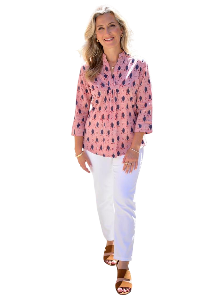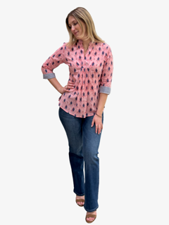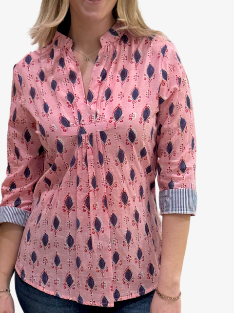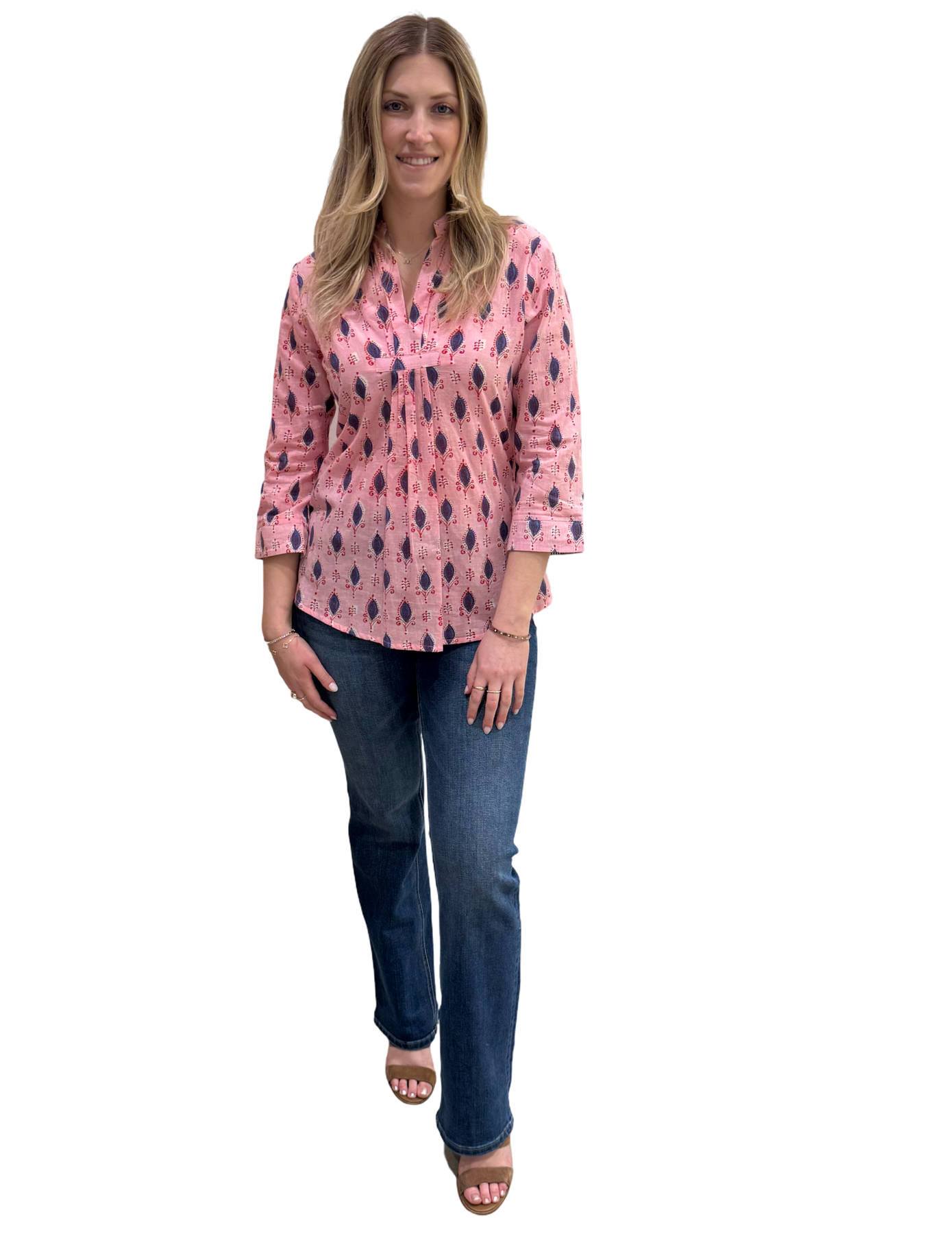 Fun and flattering soft cotton print top with notch collar and striped contrast trim. This tailored 3/4 sleeve style has an easy fit and is a shirt length shape that pairs well with jeans or colored pants. Cold gentle cycle wash line dry. Model is 5'10" wearing a size small.