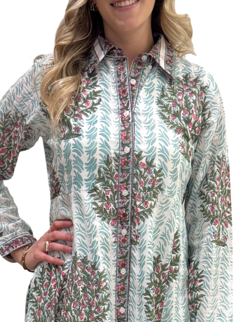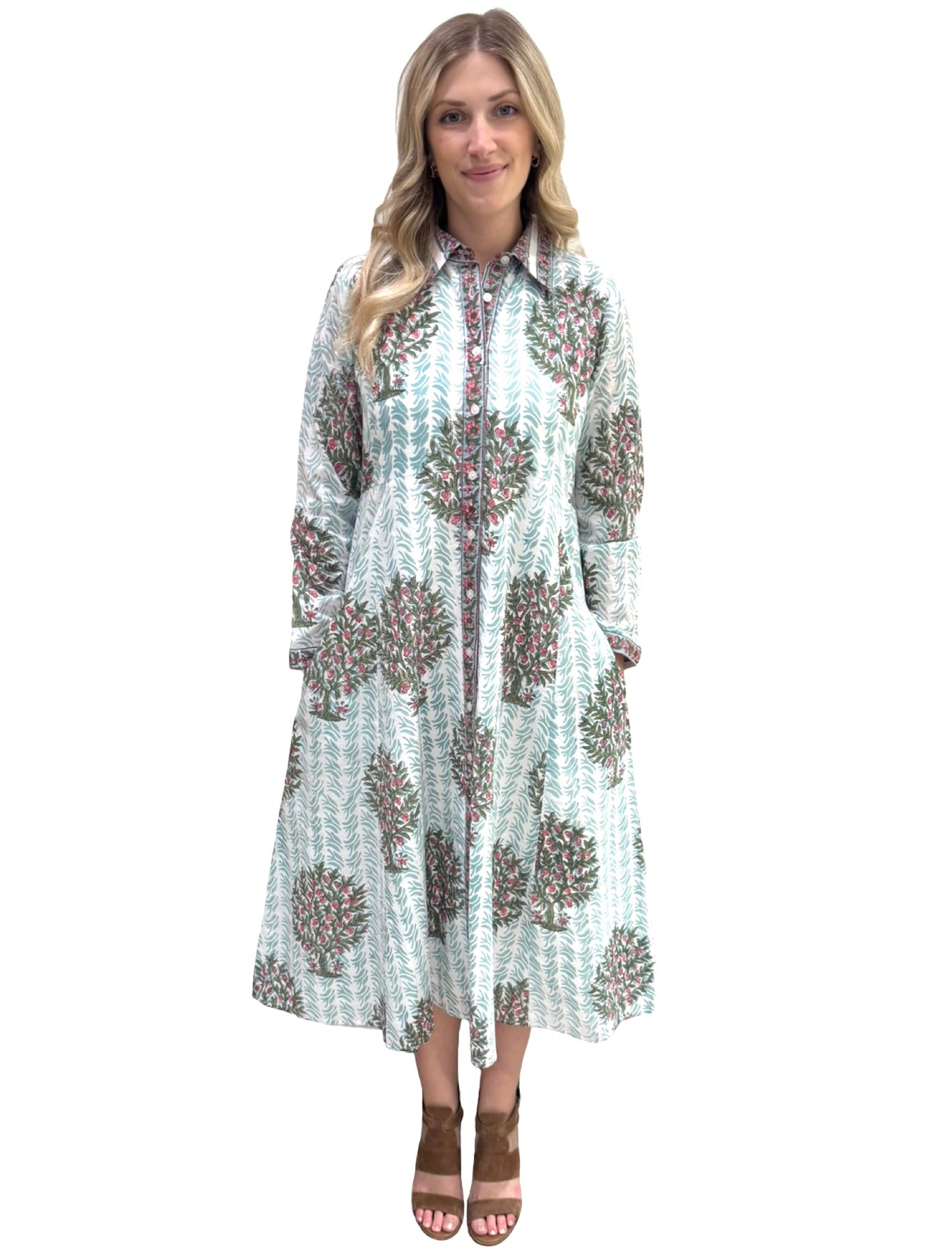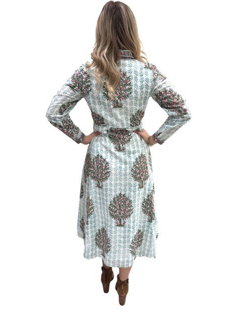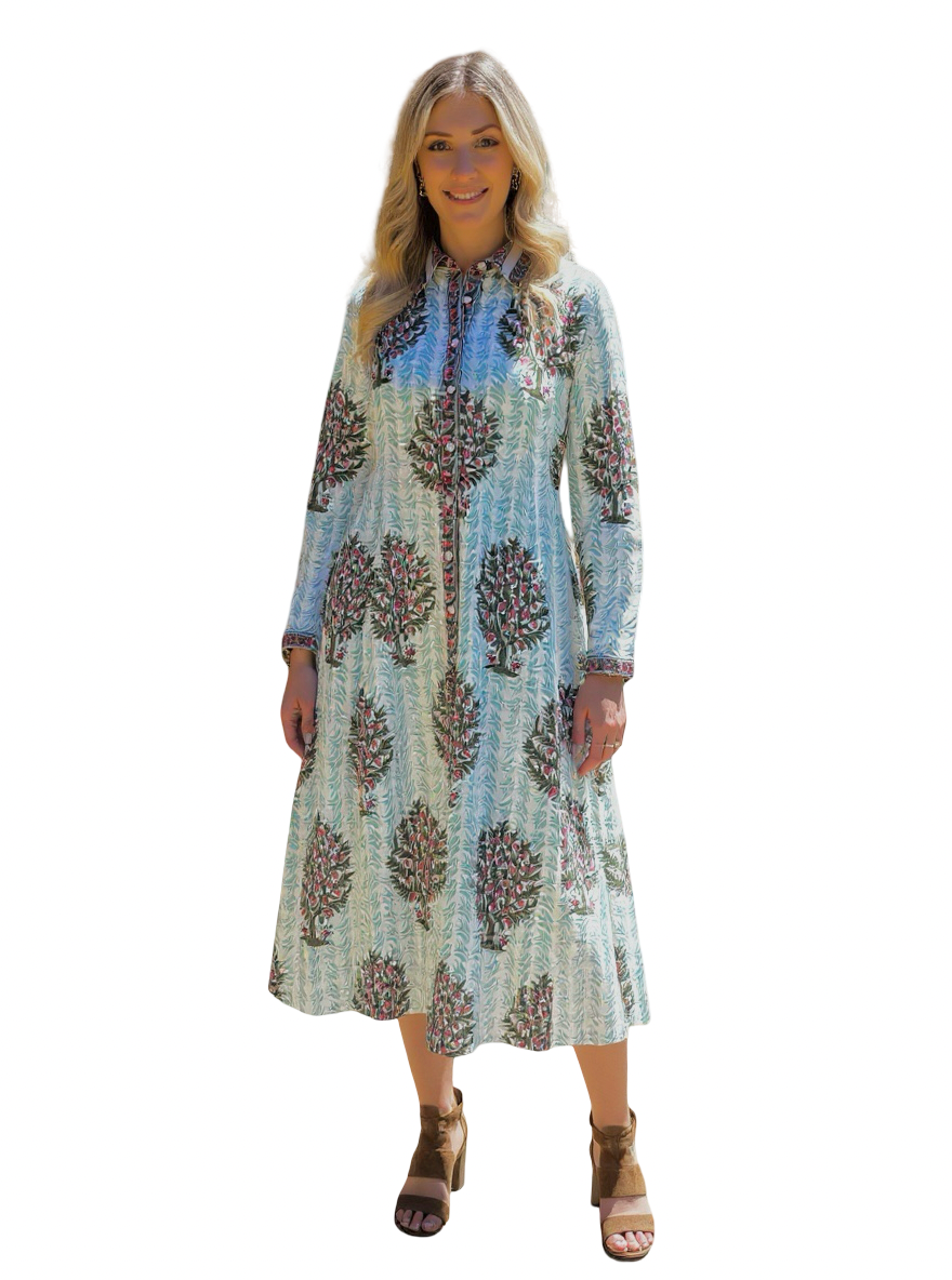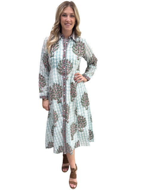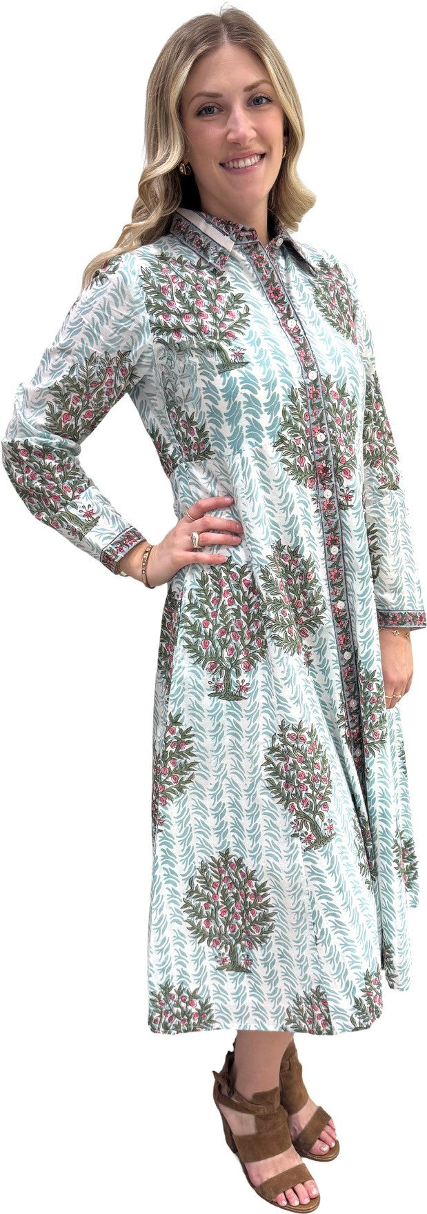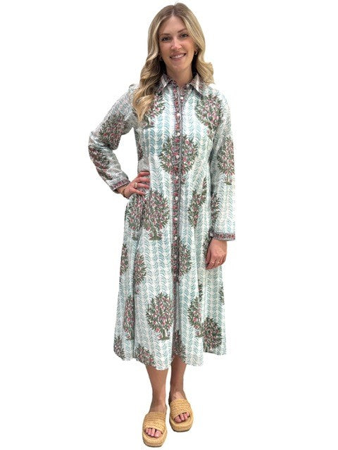A party ready print in a beautiful floral hand-block. A unique combination of fabrics has been used to create this beautiful long length dress. This style has been accented with a complimentary striped trim and a flattering gold button front placket. With long sleeves and a tiered hem detail this style is an easy piece for day to night style. Side pockets.