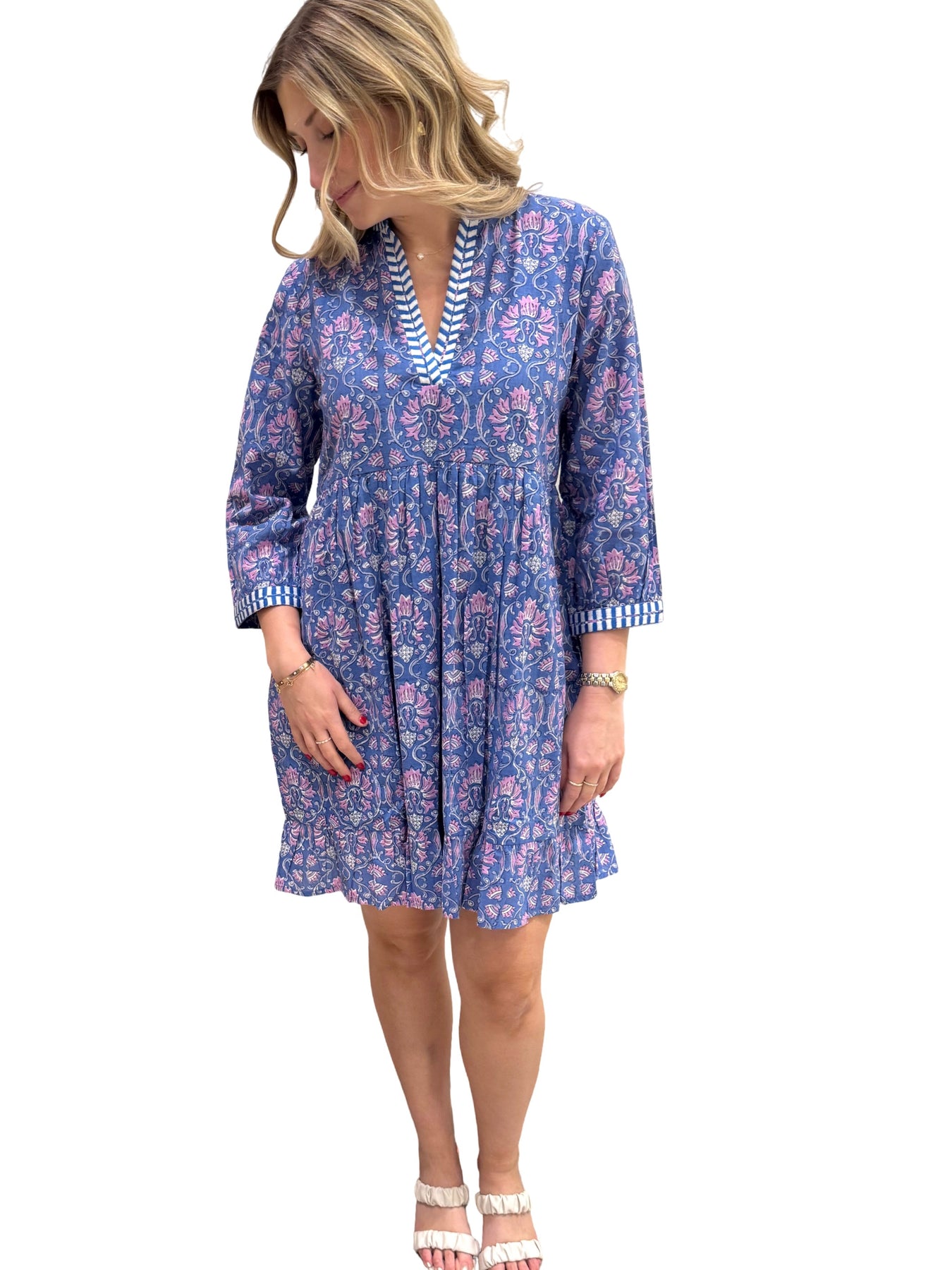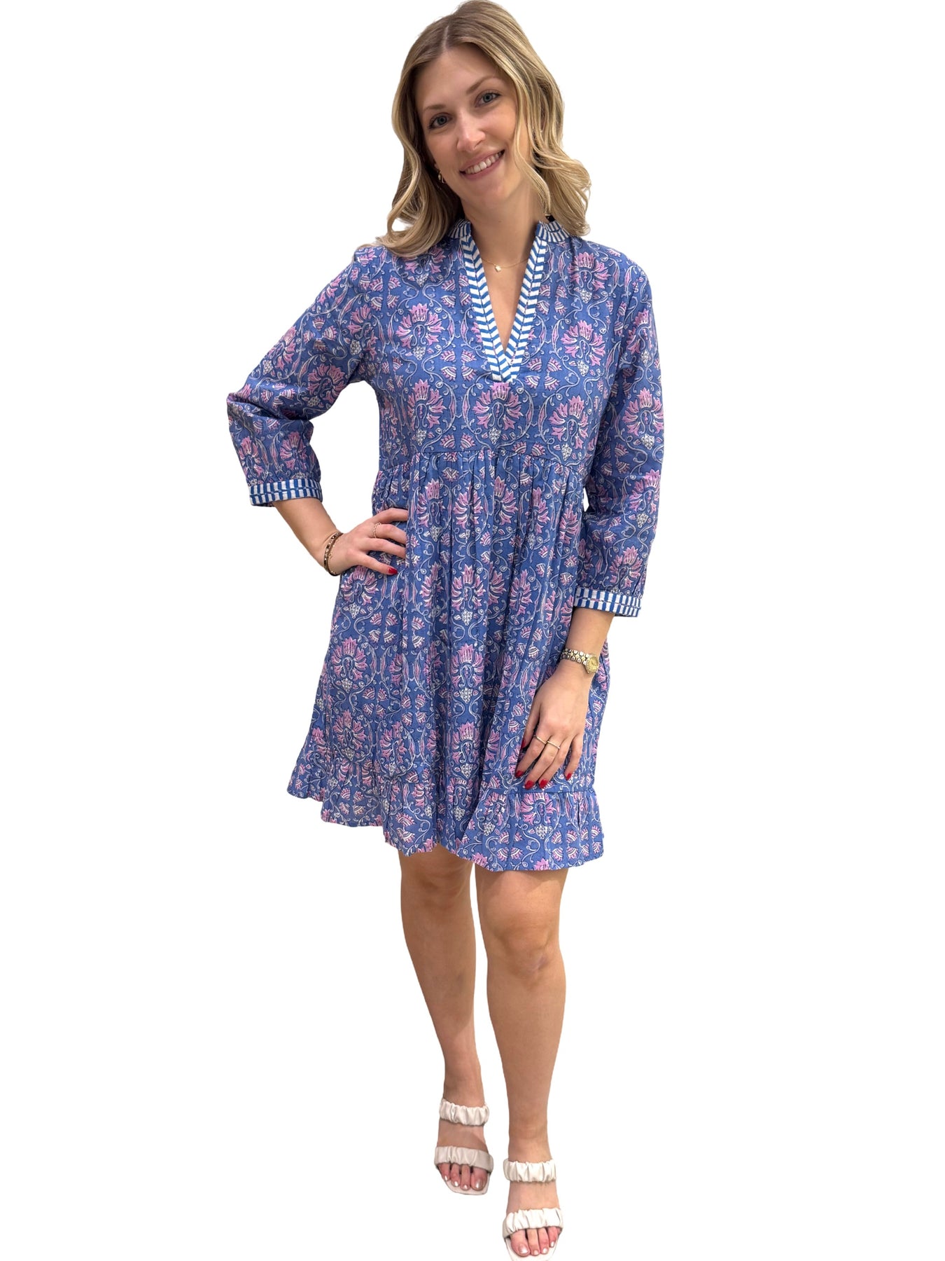 A cotton lined fun in the sun style with custom floral print and embroidered trim detail, A notched neck relaxed easy fit with side pockets. Cold hand wash, line dry. Model is 5'9" wearing a size small.