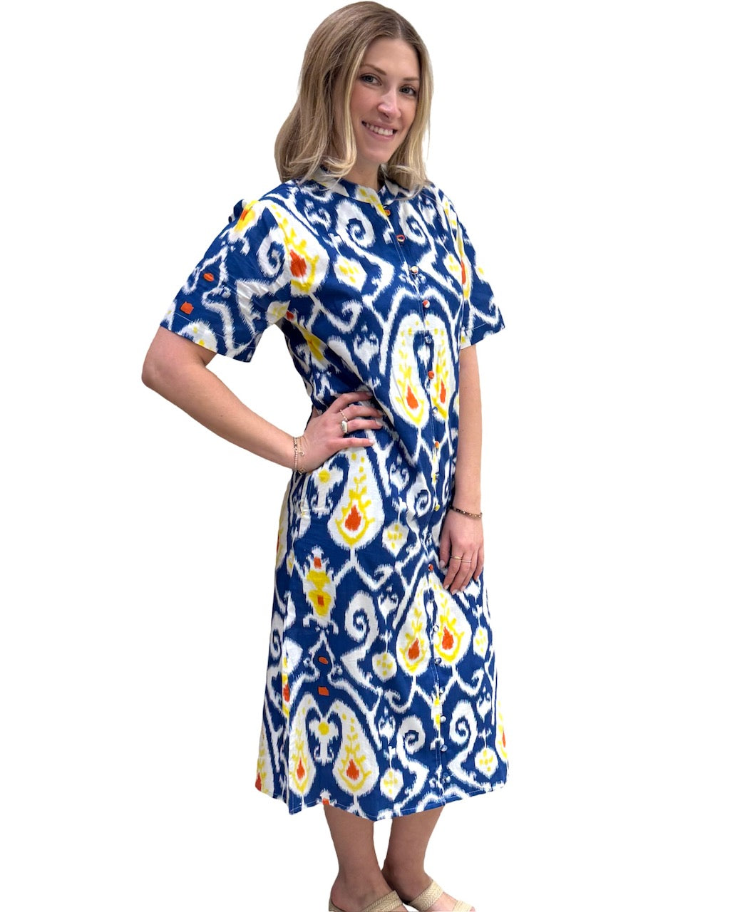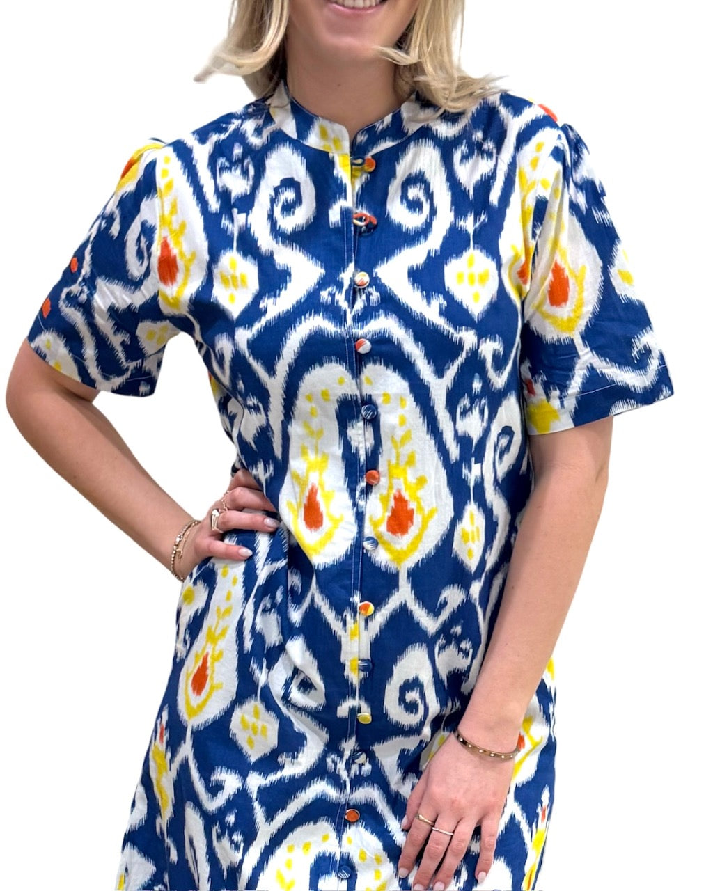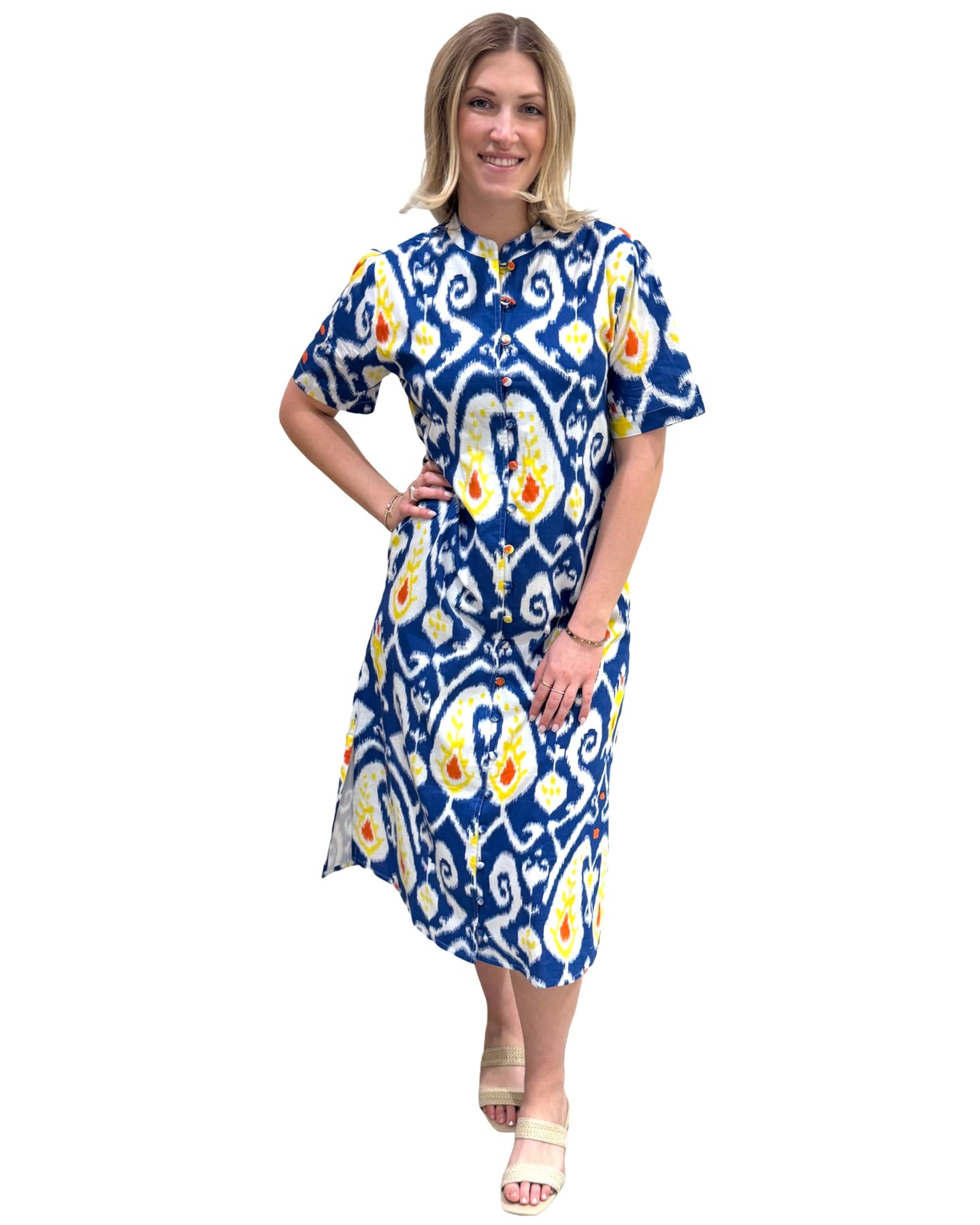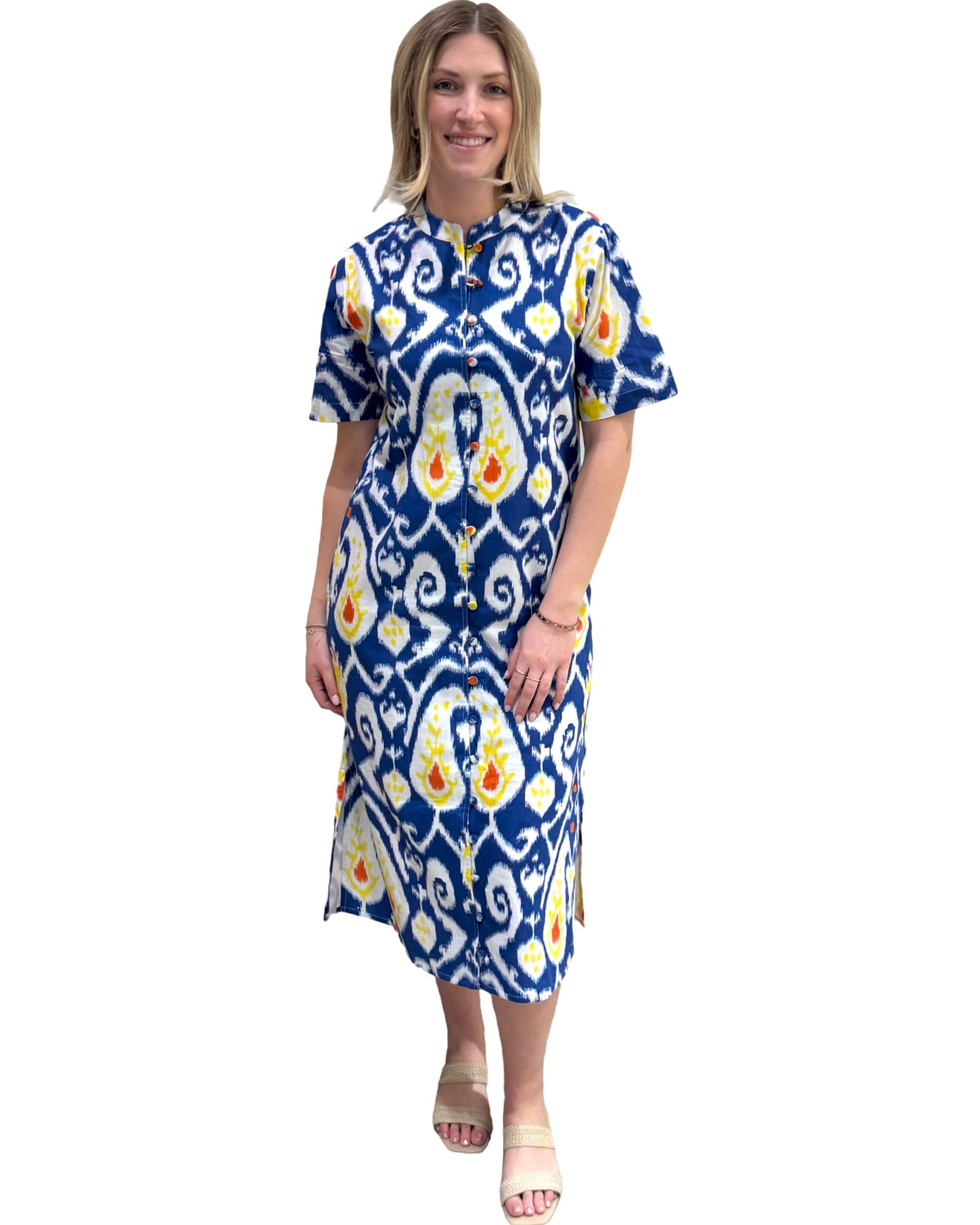 A beautiful streamlined silhouette with self covered buttons, side pockets, mandarin collar and lining. A timeless classic with endless possibilities. Model is 5'9" wearing a size small. Cold gentle cycle wash line dry.