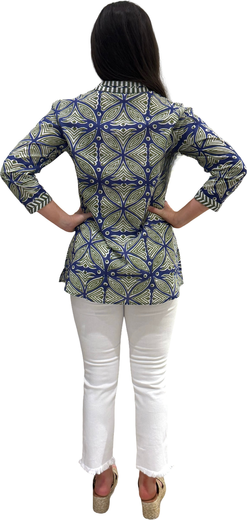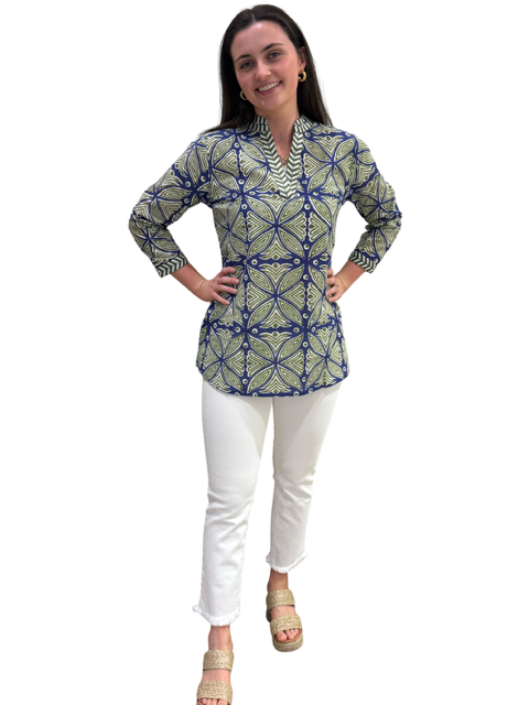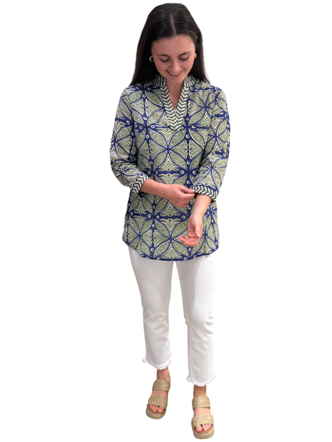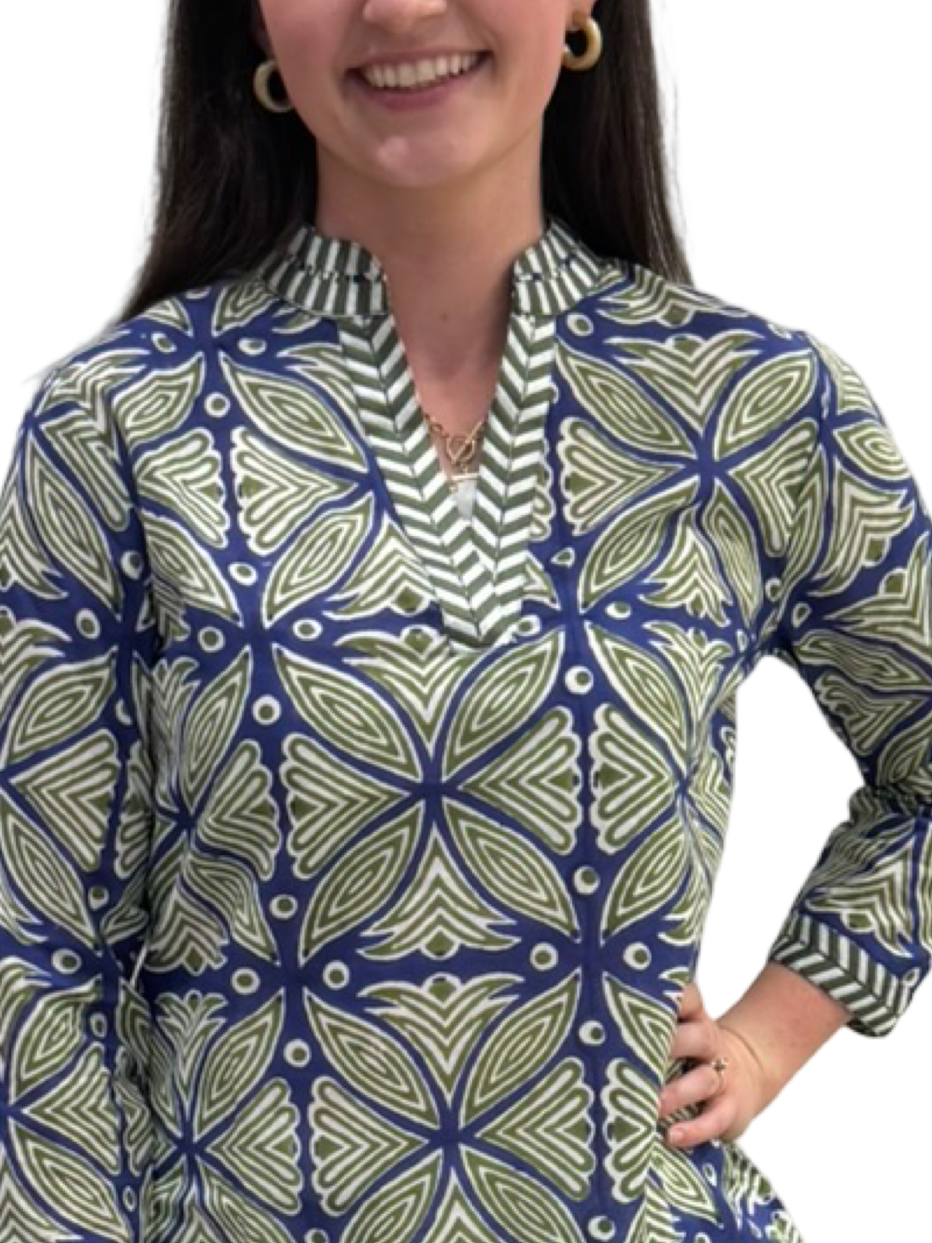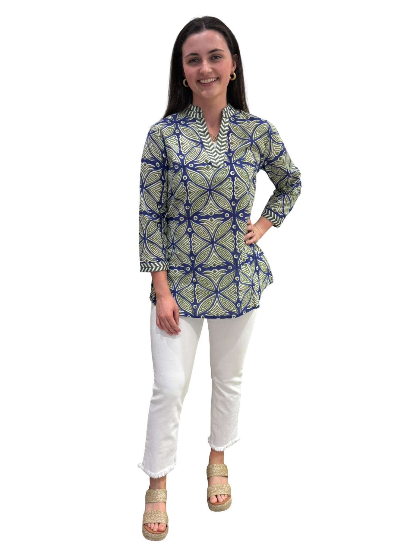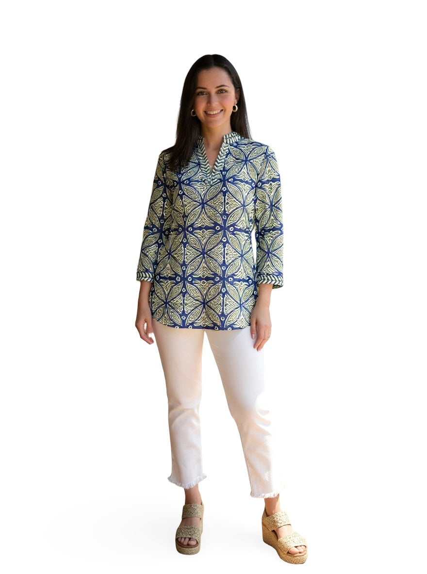 A timeless classic tunic in soft hand blocked floral cotton. A tailored fit with embroidered trim detail. Dress this piece up for a night on the town or make it playful with jeans and your favorite wedges. Hand wash cold line dry. Model is 5’8” wearing a size small.