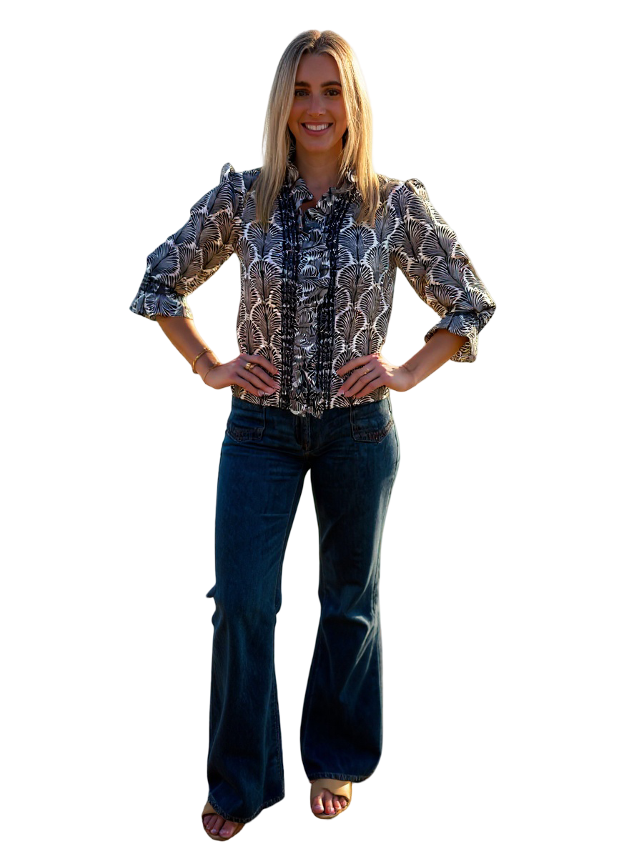 A beautiful shorter length statement smocked cotton ruffle trim top. Button-down front and subtle puff sleeves make this the perfect day to evening cotton blouse. Cold gentle cycle wash line dry. Model is 5'11" wearing a size small.