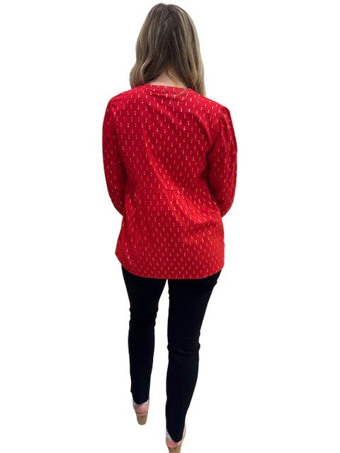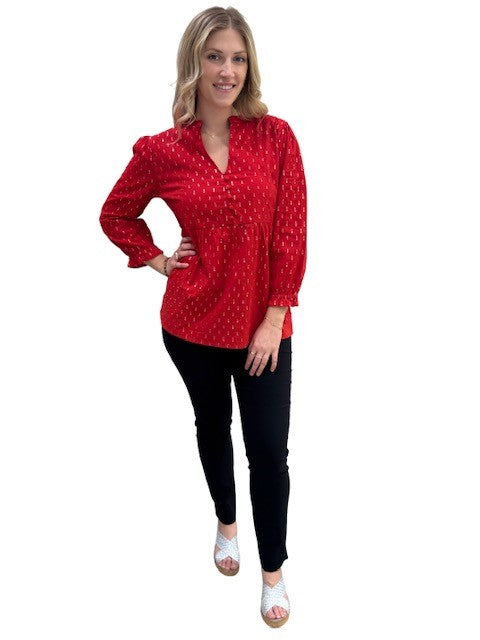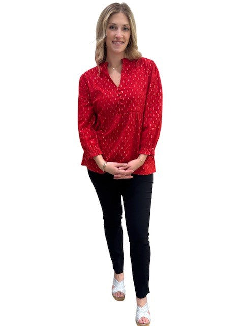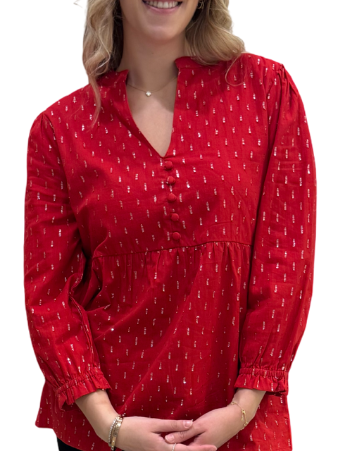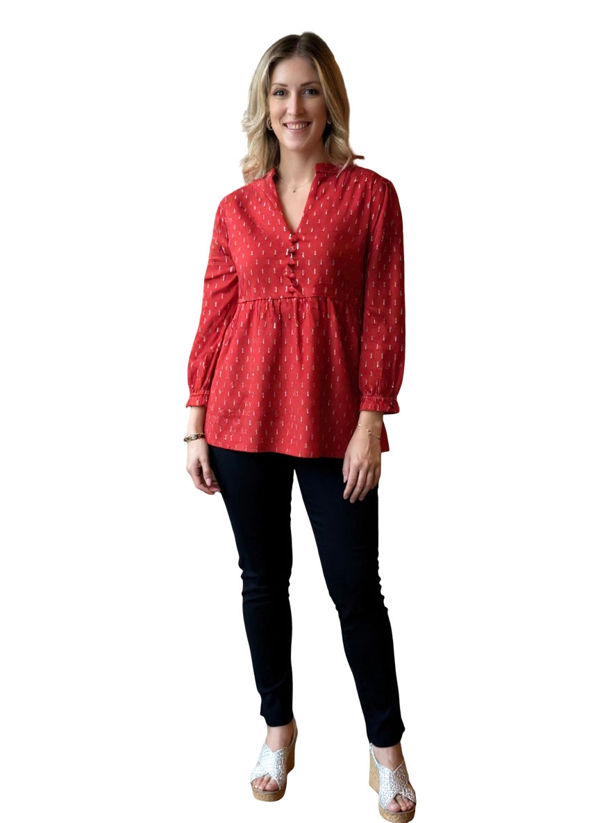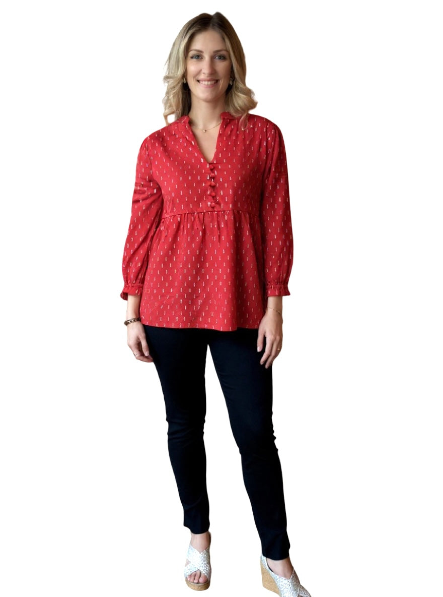 A fun and easy style to wear the Cameron top has been created in a unique combination of re and silver with self-covered button detail. This soft cotton lined top has a gentle flounce detail that adds to the flattering cut. A great year-round style to pair with denim and black jeans. Cold wash line dry. Model is 5'9" wearing a size small.
