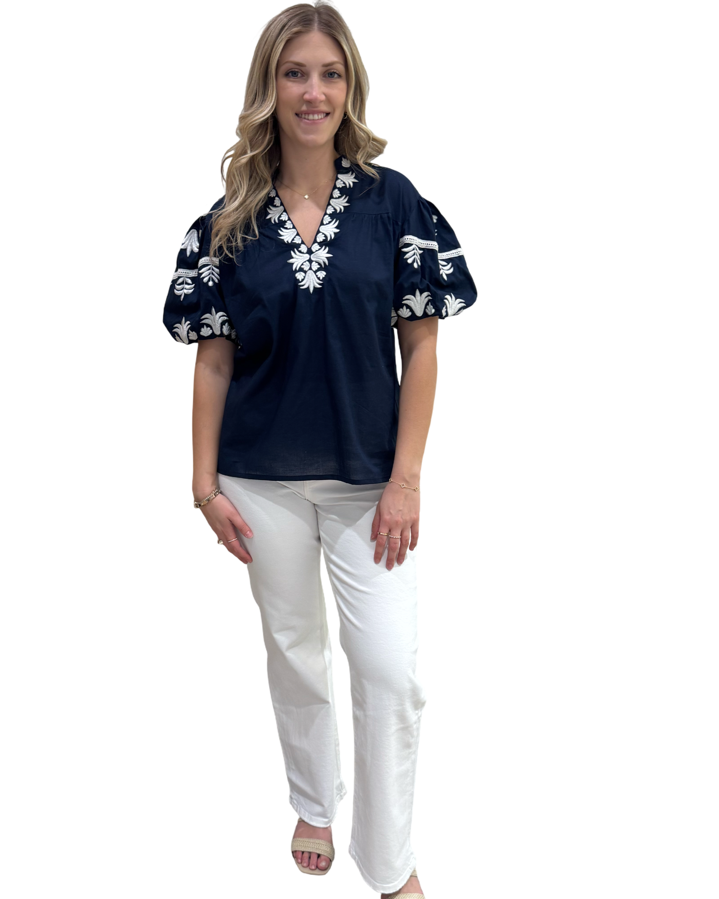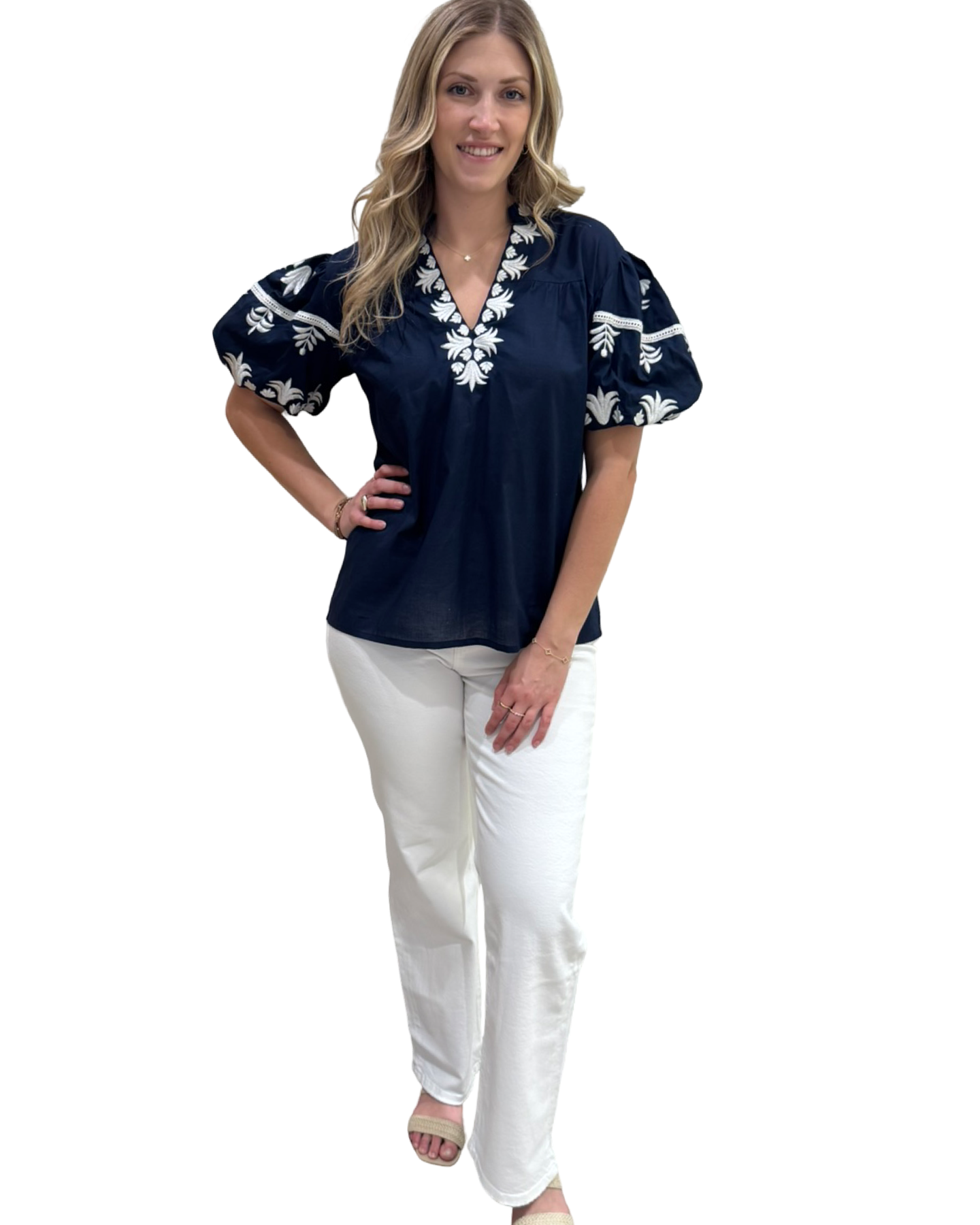A fun and functional embroidered lined cotton short sleeve top. Embroidered detailing makes for an easy-to-wear classic round piece. Cold hand wash, line dry. Model is 5'9 wearing a size small.