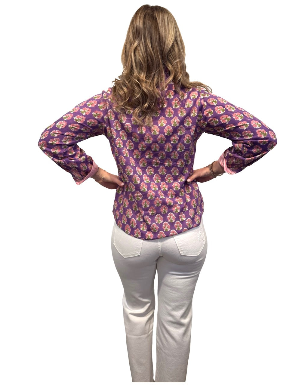 A year-round cotton top with gold buttons and striped trim detailing. Wear it as a fun top with jeans or throw on a belt and pair it with a skirt and booties for a work to weekend look. Relaxed cut. Cotton cold gentle wash, line dry. Model is 5'9" wearing a size small.